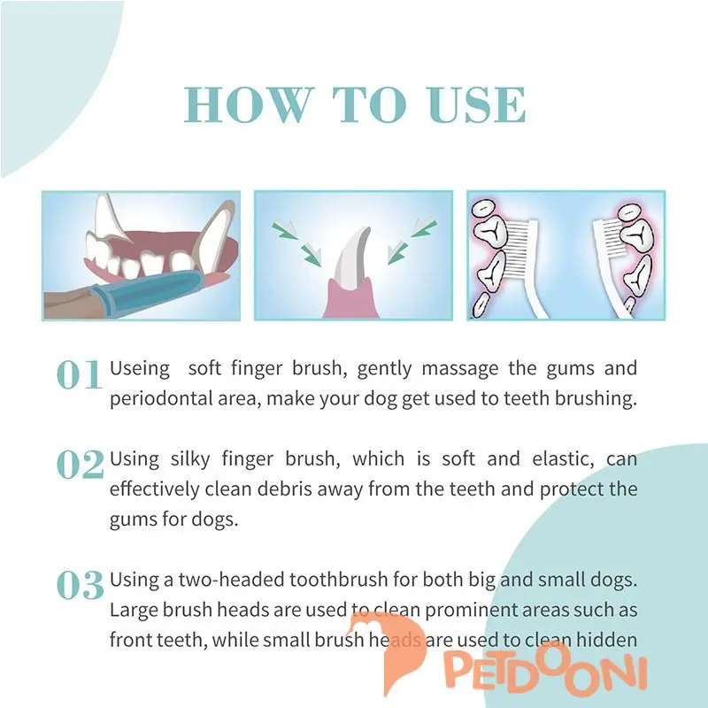مقداری از خمیردندان را روی مسواک بگذارید و اجازه دهید سگ آن را بو کند و بچشد. در مرحلۀ بعد فقط بگذارید مسواک با دندانها تماس داشته باشد. بعد از اینکه سگ به این کار عادت کرد، چند ثانیه دندانها را مسواک بزنید. توجه داشته باشید که یکی دو ماه طول می کشد تا سگ به این کار عادت کند. به همین دلیل در انجام اینکار عجول نباشید و صبر داشته باشید. وقتی سگ کاملا برای مسواک زدن آماده بود، لب هایش را هم کنار بزنید تا دندان ها و لثه ها را ببینید و تمیز کنید. مسواک را از خط لثه تا نوک دندان ها بر روی دندان بکشید. مراقب باشید که نباید دهان سگ را به زور باز کنید. این کار او را می ترساند و مسواک زدن را به چالشی سخت برایتان تبدیل می کند. برای کسب نتیجه بهتر ۱ بار در روز و یا ۳ بار در هفته اینکار را انجام دهید.