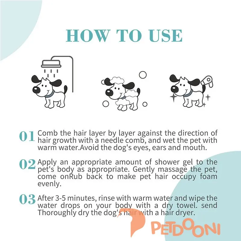 ابتدا موهای پت را به طور کامل با آب گرم خیس کنید. اگر ذرات گل و خاک به پوشش مویی سگ شما چسبیده است، آن را جدا کنید. سپس مقداری شامپو روی بدن پت ریخته و به آرامی ماساژ دهید. برای کمک به شست و شو، می توانید با استفاده از یک برس به آرامی ماساژ دهید. پس از اتمام این کار، با آب فراوان بشویید به طوری که شامپو کاملا از بدن پت پاک شود. سپس با استفاده از یک حوله مقداری از آب بدن سگ خود را بگیرید و پس از آن با استفاده از مسواک یا برس مخصوص، به طور مداوم موهای پت خود را برس کشیده و با باد ملایم سشوار کاملا خشک کنید.