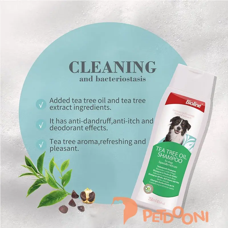 شامپو سگ بایولاین حاوی روغن درخت چای (Bioline Tea Tree Dog Shampoo)، با کیفیت بسیار بالایی تولید شده است و برای سگهایی که به طور مداوم شست و شو میشوند بسیار مناسب میباشد. این شامپو حاوی عناصری است که بوی نامطبوع و بد بدن سگ را از بین میبرد. باید به این نکته اشاره کرد که این شامپو حساسیت زا نیست و برای همه نژاد سگها مناسب می باشد. شامپو سگ بایولاین حاوی روغن درخت چای اثر ضد التهاب و ضد باکتری خفیفی دارد؛ از این جهت برای شست و شوی پوستهای حساس نیز مناسب است. فرمولاسیون شامپو به گونهای است که سبب براق شدن پوشش مویی سگ خواهد شد. در ساخت این شامپو از مواد اولیه مرغوب استفاده شده است تا میزان حساسیت به صفر برسد.
