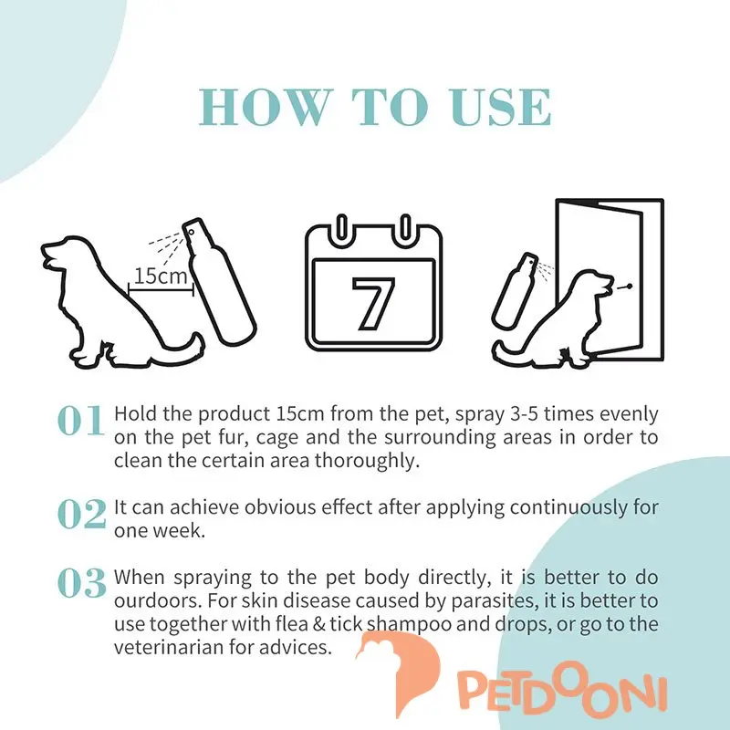 این محصول جهت استفاده خارجی طراحی شده و یک ماده خوراکی نمی باشد. این محصول با توجه به بافت موی حیوانات طراحی شده و برای استفاده انسان توصیه نمی شود. از تماس مستقیم این محصول با چشم پت جداً خودداری کنید. لطفا هنگام استفاده از دستکش استفاده نمائید. اسپری را تا زمانی که پوست کمی مرطوب است بر روی تمام بدن بپاشید. گردن، دم، داخل رانها و پاها فراموش نشود. برای توله سگ کمتر از ۳ ماه استفاده نگردد. بسته به شدت آلودگی درمان باید ۲ بار در هفته تکرار شود. لازم به ذکر است که از نوازش حیوان به مدت حداقل ۳ ساعت خودداری کنید.