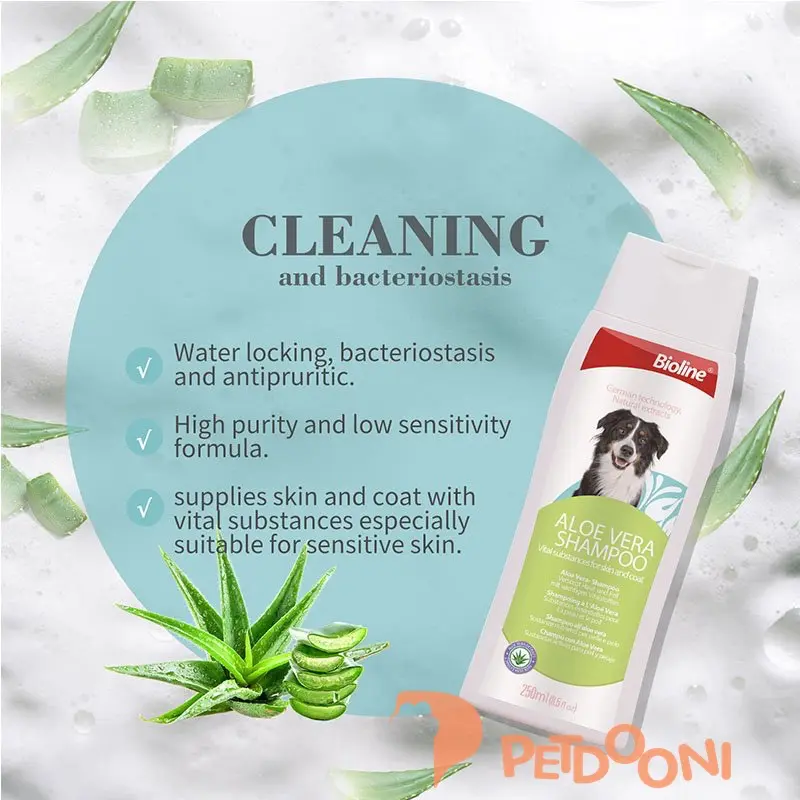 شامپو سگ بایولاین حاوی آلوئه ورا (Bioline Aloe Vera Dog Shampoo)، یک شامپوی سگ حرفهای برای شستشوی سگ شماست که حاوی آلوئه ورا میباشد. آلوئه ورا به عنوان یک ماده طبیعی، به رطوبت رسانی پوست سگ کمک میکند و باعث بهبود سلامت پوست و موی آنها میشود. این شامپو با فرمولاسیون منحصر به فرد خود، به طور موثری روی موهای حیوان خانگی شما عمل کرده و آنها را تمیز و نرم میکند. این شامپو حاوی مواد نرمکننده است که به رطوبت رسانی پوست سگ کمک میکنند و باعث بهبود سلامت پوست و موی آنها میشود.