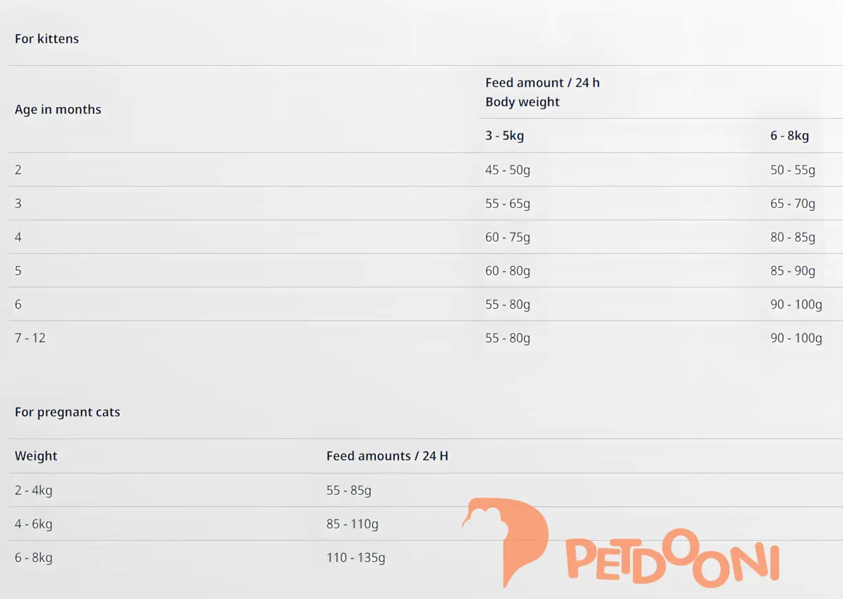 "مقدار مصرف روزانه" بچه گربه 2 ماهه: به ازای هر کیلوگرم وزن بدن 50 گرم بچه گربه 3 ماهه: به ازای هر کیلوگرم وزن بدن 45 گرم بچه گربه 4 ماهه: به ازای هر کیلوگرم وزن بدن 40 گرم بچه گربه 5 ماهه: به ازای هر کیلوگرم وزن بدن 35 گرم بچه گربه 6 ماهه: به ازای هر کیلوگرم وزن بدن 30 گرم بچه گربه 12-7 ماهه: به ازای هر کیلوگرم وزن بدن 20 تا 30 گرم گربه باردار با وزن 2-4 کیلوگرم 40 تا 90 گرم گربه باردار با وزن 4-6 کیلوگرم 90 تا 140 گرم گربه باردار با وزن 6-8 کیلوگرم 140 تا 180 گرم