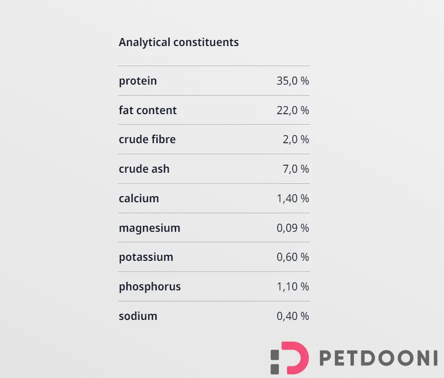"مقدار مصرف روزانه" بچه گربه 2 ماهه: به ازای هر کیلوگرم وزن بدن 55 گرم بچه گربه 3 ماهه: به ازای هر کیلوگرم وزن بدن 50 گرم بچه گربه 4 ماهه: به ازای هر کیلوگرم وزن بدن 45 گرم بچه گربه 5 ماهه: به ازای هر کیلوگرم وزن بدن 40 گرم بچه گربه 6 ماهه: به ازای هر کیلوگرم وزن بدن 35 گرم بچه گربه 12-7 ماهه: به ازای هر کیلوگرم وزن بدن 25 تا 30 گرم گربه باردار با وزن 2-4 کیلوگرم 50 تا 100 گرم گربه باردار با وزن 4-6 کیلوگرم 100 تا 150 گرم گربه باردار با وزن 6-8 کیلوگرم 150 تا 190 گرم