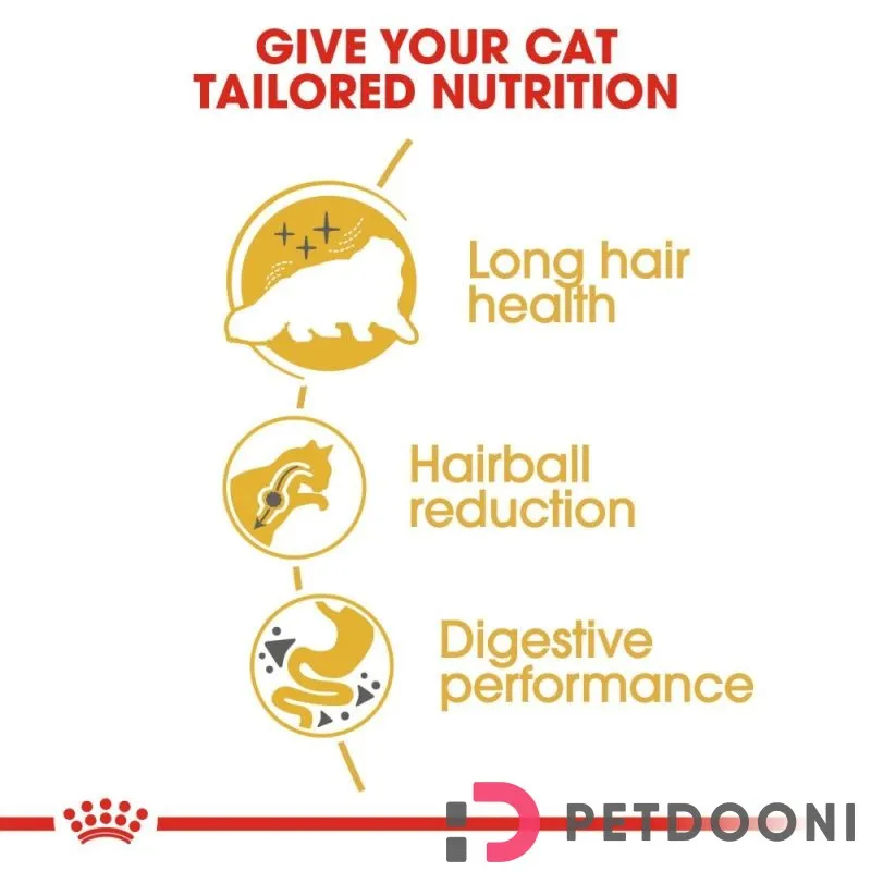 موی بلند و ضخیم گربههای پرشین آنها را در معرض خطر تشکیل گلولههای مویی (Hairballs) قرار میدهد. این گلولهها معمولاً در اثر لیسیدن موها بهوجود میآیند و در صورت تجمع در معده، ممکن است مشکلات گوارشی ایجاد کنند. ترکیب ویژه فیبرهای موجود در غذای خشک پرشین رویال کنین به دفع طبیعی این هیربالها از طریق دستگاه گوارش کمک میکند.