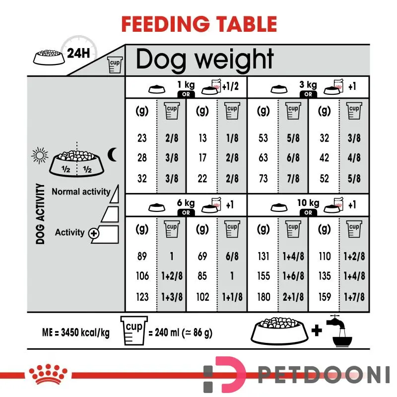 برای تعیین دقیق مقدار غذا، میتوانید از جدول پیشنهادی پشت بستهبندی استفاده کرده یا با دامپزشک مشورت کنید. تغذیه بیش از حد یا کمتر از نیاز ممکن است به افزایش وزن یا کمبود مواد مغذی منجر شود.