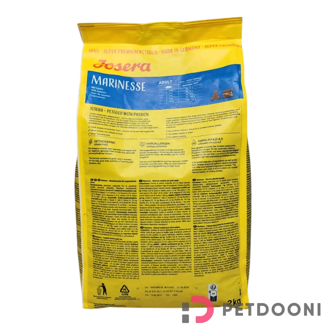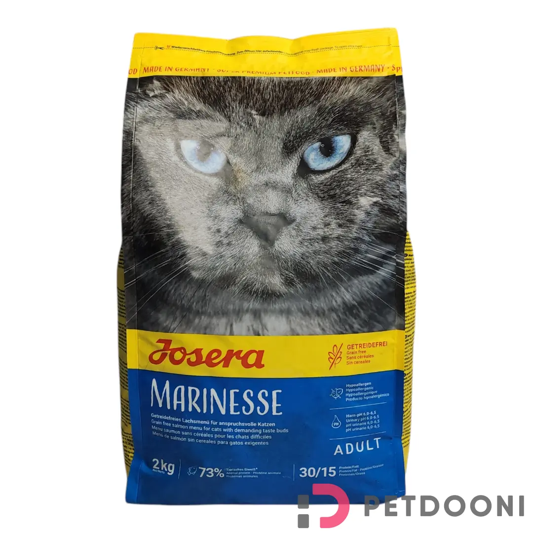 غذای خشک گربه جوسرا مدل مارینس Josera Marinesse غذایی مناسب برای گربههای حساسی است که مشکلات گوارشی دارند، زیرا در ترکیبات آن غلات وجود ندارد و برنج و سیب زمینی به کار رفته در این غذا به عنوان منبع کربوهیدرات و همچنین محتوای پروتئینی کاهش یافته، فرایند هضم را تسهیل میکند. همچنین این غذا سرشار از ماهی سالمون خوشمزه به عنوان منبع اصلی پروتئین و منبع اسیدهای چرب امگا 3 و -6 حیاتی است و به همین دلیل، مصرف آن باعث سلامت هر چه بیشتر پوست و براق و ابریشمی شدن پوشش دوست پشمالوی شما میشود. محتوای مطلوب کلسیم،فسفر و کاهش منیزیم نیز به حفظ pH ادرار در محدوده نرمال کمک کرده و از تشکیل و تجمع سنگهای ادراری و بروز مشکلات کلیوی و مثانه جلوگیری میکند.