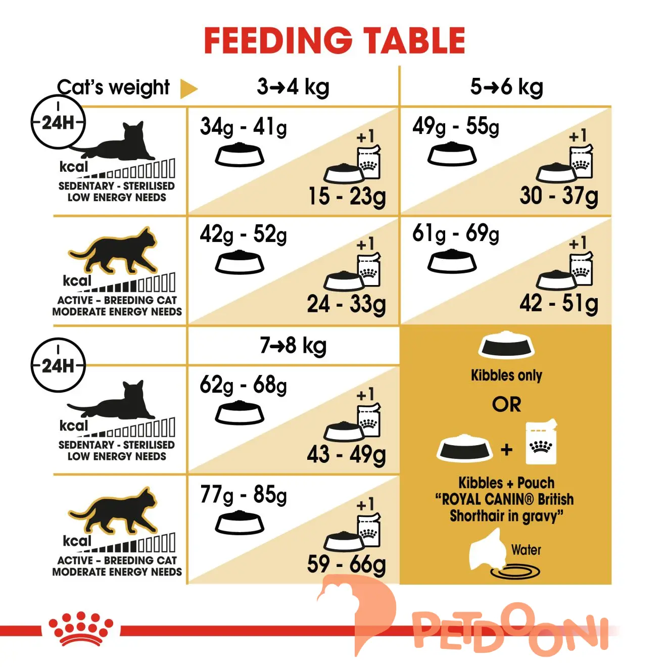غذای خشک گربه بریتیش ادالت رویال کنین (Royal Canin Cat British Shorthair Adult) وزن 2 کیلوگرم یک غذای خشک ایدهآل است که برای پاسخگویی به نیازهای غذایی بینظیر این نژاد، با داشتن پروتئین بهینه متعادل و سطح بالای L- کارنیتین، به تقویت عضلات کمک میکند. این غذا همچنین حاوی مواد مغذی حیاتی مانند گلوکوزامین و کندرویتین است که به سالم نگه داشتن استخوانها و مفاصل و همچنین اطمینان از رشد خوب بدن کمک بسزایی میکند. از آنجا که گربه بریتیش میتواند به صورت ژنتیکی در برخی از بیماریهای قلبی مانند کاردیومیوپاتی هیپرتروفیک قرار بگیرد. غذای خشک گربه بریتیش ادالت رویال کنین بزرگسالان دارای بالانس خوبی از تورین، آنتیاکسیدانها و اسیدهای چرب مهم امگا 3 است که همگی میتوانند به حمایت از سلامت قلب و اطمینان از عملکرد قوی قلب کمک کند. در پت دونی محصولات رویال کنین تحت کنترل دقیق دوکتر دامپزشک قرار میگیرند، تا اطمینان حاصل شود که گربه شما یک غذای باکیفیت عالی و متناسب با نیازهای غذایی فردی و سبک زندگی خاص دریافت میکند. میزان پروتئین در غذای خشک گربه بریتیش ادالت رویال کنین متناسب با بدن عضلهای گربههای بریتیش در نظر گرفته شده و درصد بالایی از غذا را تشکیل میدهد. همچنین حاوی ال-کارنیتین است که تاثیر بسزایی در متابولیسم چربیها دارد. اسید های چرب امگا 3 EPA و DHA موجود در این غذا، علاوه بر تاثیر در زیبایی پوست و مو، به حفظ سلامت استخوانها نیز کمک میکند. میزان متعادل مواد معدنی و فورمولاسیون آن نیز به حفظ سلامت دستگاه قلبی و عروقی و همچنین دستگاه ادراری کمک میکند. اندازه دانههای غذا متناسب با دهان این گربه است و کمی حالت خمیده دارد تا بهتر جویده شود. این غذا حاوی پروتئین سازگار با نیازهای گربه شما میباشد. با این غذا توده عظلانی قوی پیدا کرده و باعث عملکرد صحیح قلب میشود. همچنین غذای خشک گربه بالغ بریتیش برند رویال کنین غنی از کلسیم است و برای جلوگیری از تارتار دندانی بسیار حائز اهمیت است.