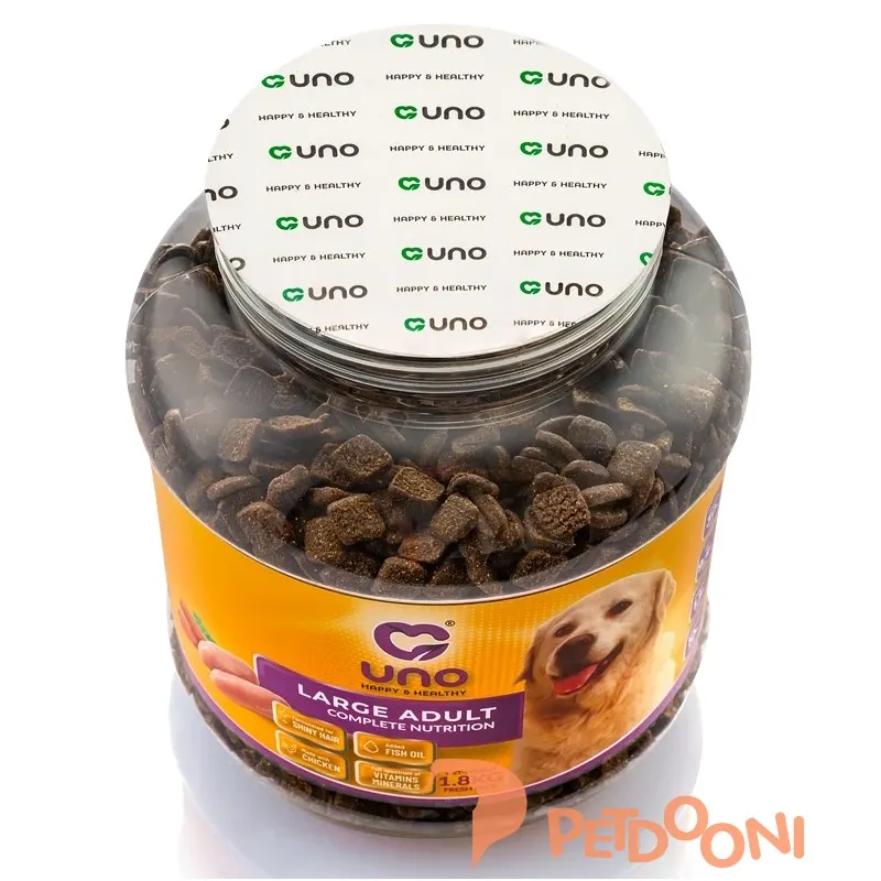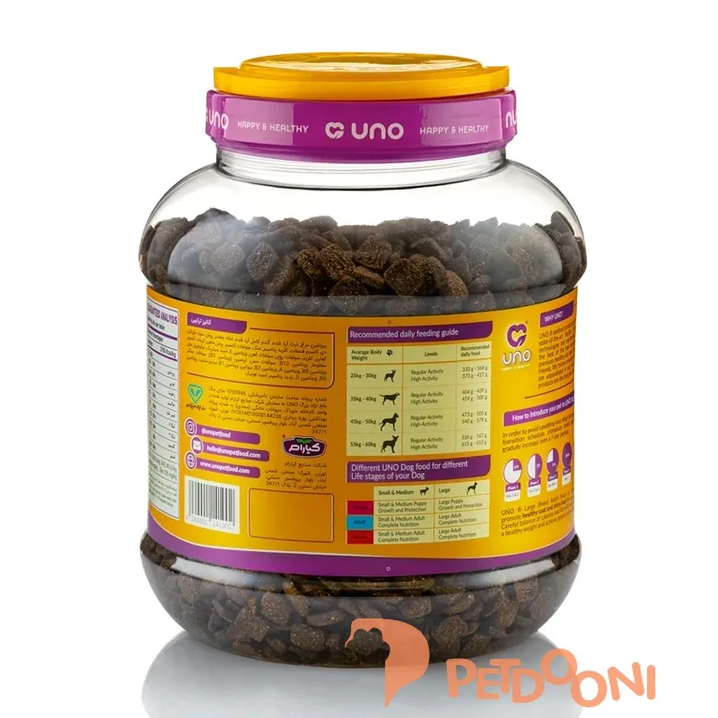 فرمولاسیون دقیق و علمی این غذا موجب شده تا تمام نیازهای تغذیهای سگ بالغ بدون نیاز به استفاده از مکملهای اضافی تامین شود. ترکیبات انتخاب شده در این محصول، با دقت از نظر علمی و تحقیقاتی مورد بررسی قرار گرفتهاند تا سگ شما بتواند از هر وعده غذایی بهترین بهره را ببرد. استفاده از این غذا، تجربهای متفاوت و رضایتبخش برای سگهای بزرگ به همراه دارد. طعم و مزه عالی غذای خشک اونو، علاوه بر تأمین نیازهای تغذیهای، موجب تحریک اشتهای سگ شما میشود. این غذا به گونهای طراحی شده است که حتی سگهای حساس و گیج غذا نیز با علاقه و سرعت از آن استفاده کنند. طعم خوشایند آن، همراه با عطر دلنشین، سگ شما را به سمت تغذیه سالم و متعادل سوق میدهد. این محصول به گونهای فرموله شده است که با تقویت سیستم ایمنی، سلامت پوست و موی سگ شما را بهبود میبخشد و همچنین عملکرد سیستم عصبی را از پایه تقویت میکند. استفاده مداوم از این غذا، باعث افزایش انرژی و نشاط در سگ شما شده و وی را به همراه تغذیهای کامل، از هر نظر سالم نگه میدارد. غذا خشک اونو برای سگهای بالغ نژاد بزرگ، مناسب کسانی است که به دنبال تغذیهای همزمان از نظر کیفیت و ارزش غذایی هستند. این محصول با ارائه ترکیبی از مواد مغذی، به بهبود عملکرد بدن، رشد عضلات و تقویت استخوانها کمک شایانی میکند. انتخاب این غذا به منزله سرمایهگذاری در سلامتی دوست وفادار شماست. فرمولاسیون بهینه و کامل این غذا، موجب میشود تا سگ شما از یک رژیم غذایی متعادل بهرهمند شود. این محصول نه تنها به حفظ توازن مواد معدنی و آنتیاکسیدانها کمک میکند، بلکه موجب بهبود عملکرد گوارش و جذب بهتر مواد مغذی نیز میگردد. به همین دلیل، والدینی که به دقت به انتخاب غذای مناسب برای سگهای نژاد بزرگ خود میپردازند، اغلب محصول اونو را برمیگزینند. با توجه به نیازهای فیزیکی و ساختاری سگهای بزرگ، میزان کلسیم، فسفر و منیزیم موجود در این غذا به گونهای محاسبه شده است که حمایت لازم از استخوانها و مفاصل را فراهم آورد. تقویت ساختار اسکلتی به ویژه در دوران رشد و نگهداری سگهای بالغ، از اهمیت ویژهای برخوردار است و این محصول با داشتن تناسب دقیق این مواد، یک انتخاب ایدهآل محسوب میشود. ترکیب غنی از ویتامینهای A، D، E، و ویتامینهای گروه B در این غذا موجب بهبود متابولیسم، سلامت چشم، پوست و موی سگ میشود. این ویتامینها علاوه بر ایفای نقش در فعالیت سلولی، به بهبود کیفیت زندگی و افزایش طول عمر سگهای بزرگ کمک میکنند. مصرف منظم این غذا، تغییری مثبت در وضعیت کلی سلامتی سگ شما ایجاد خواهد کرد. وجود امگا ۳ و امگا ۶ در این فرمولاسیون، به تقویت سیستم ایمنی و بهبود سلامت قلب و عروق کمک میکند. همچنین این ترکیبات باعث بهبود درخشندگی پوست و موی سگ شده و از بروز مشکلات پوستی جلوگیری میکنند. ترکیب آنتیاکسیدانهای موجود در این غذا، نقش مهمی در مقابله با رادیکالهای آزاد و تحت تأثیر قرار دادن فرایندهای پیری ایفا میکند.