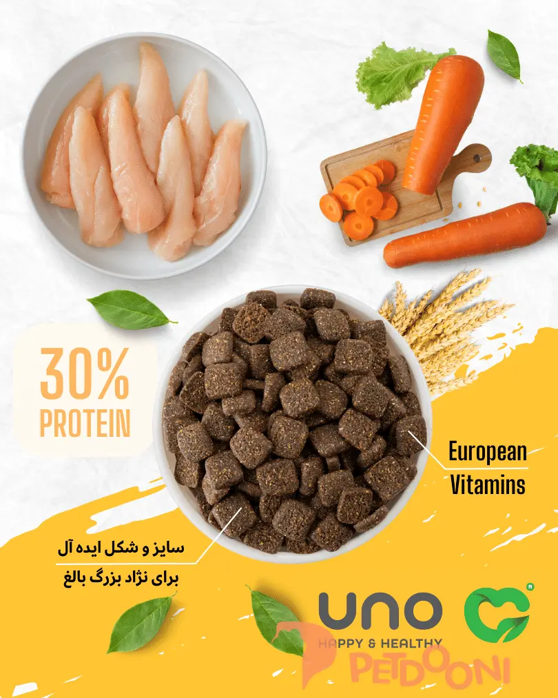 • دارای استاندارد سازمان نظام دامپزشکی کشور • مواد اولیه تامین شده از BASF آلمان،DSM هلند و Adisseo فرانسه • دارای 30% پروتئین با کیفیت • از با کیفیت ترین غذاهای تولید داخل • مناسب سگهای بالغ نژاد بزرگ • در بسته بندی 2 کیلویی شرکت اونو • با طعم مرغ • محصول ایران