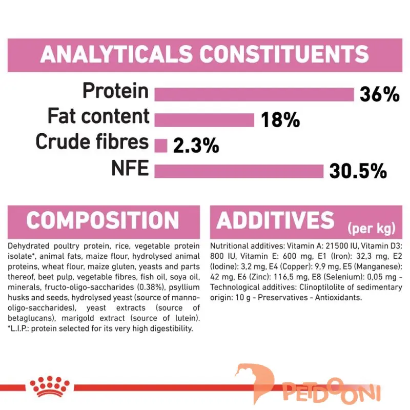پروتئین خشک طیور، برنج، کنجاله گلوتن گندم*، چربی حیوانی، کنجاله خوراک ذرت، پروتئین حیوانی هیدرولیز شده، کنجاله خوراک گندم، کنجاله گلوتن ذرت، محصولات جانبی مخمر، تفاله چغندر خشک، لیگنوسلولز، مواد معدنی، روغن سویا، روغن ماهی، پسیلیوم [پوسته و دانه]، فروکتو-الیگوساکاریدها، مخمر هیدرولیز شده [منبع مانان-الیگوساکاریدها و بتا گلوکان] (0.29%)، روغن جلبک Schizochytrium sp. [منبع DHA]، کنجاله گل همیشه بهار.