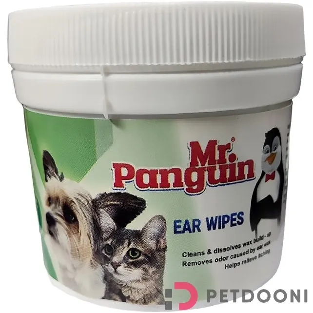 نظافت گوش سگ و گربه ها امری بسیار مهم است که در سلامتی آن ها نقش مهمی دارد. اگر ترشحات گوش سگ و گربه به موقع و به طور منظم تمیز نشوند می توانند باعث عفونت و مشکلات جدی برای سلامتی آن ها شوند. یکی از راه های تشخیص عفونت گوش بو کردن آن است. اگر سگ یا گربه شما دچار عفونت گوش شده باشد بوی بدی از آن استشمام می شود که در این مورد بهتر است به دامپزشک مراجعه نمایید. دستمال مرطوب حیوانات خانگی مستر پنگوئن مدل ear wipe وزن 70 گرم یک تمیز کننده عالی برای گوش سگ و گربه و سایر حیوانات خانگی است. استفاده از این محصول بسیار آسان است و به راحتی گوش را از آلودگی، کثیفی و چربی پاک می کند و هیچگونه حساسیتی برای حیوان خانگی ایجاد نمی کند.
