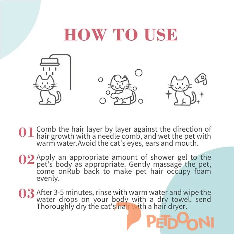 ابتدا موهای پت را به طور کامل با آب گرم خیس کنید. اگر ذرات گل و خاک به پوشش مویی گربه شما چسبیده است، آن را جدا کنید. سپس مقداری شامپو روی بدن پت ریخته و به آرامی ماساژ دهید. برای کمک به شست و شو، می توانید با استفاده از یک برس به آرامی ماساژ دهید. پس از اتمام این کار، با آب فراوان بشویید به طوری که شامپو کاملا از بدن پت پاک شود. سپس با استفاده از یک حوله مقداری از آب بدن گربه خود را بگیرید و پس از آن با باد ملایم سشوار کاملا خشک کنید.