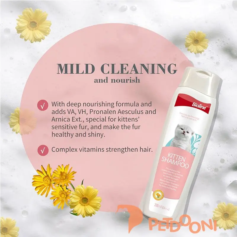 شامپو بچه گربه بایولاین (Bioline Cat Kitten Shampoo)، این شامپو با فرمولاسیونی مغذی و قوی که شامل VA، VH و مواد مغذی است، مشکلات مربوط به پوست حساس و آسیبپذیر گربههای کوچک را حل میکند در این شامپوی گربه مواد ملایم استفاده شده است که به مراقبت از پوست حساس گربههای کوچک کمک میکند تا موهای آنها سالم و درخشان شوند. این شامپو از کیفیت بسیار بالایی برخوردار است و موجب تقویت ریشه مو میگردد که با تقویت ریشه مو ریزش آن نیز کاهش مییابد. ناگفته نماند که مصرف این شامپو سبب رفع خارش پوستی شده و باعث میشود که موهای گربه همیشه رطوبت طبیعی خود را حفظ کند که در نتیجه مانع از خشکی پوست و مو میشود.