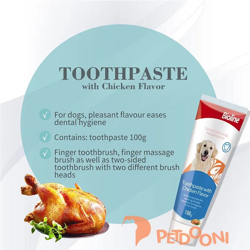 خمیر دندان سگ بایولاین با طعم مرغ (Bioline Dog Toothpaste With Chicken Flavor)، باعث افزایش سلامت دهان و دندان سگ شده و از بروز بیماریهای لثه جلوگیری میکند. استفاده از یک خمیر دندان مناسب یکی از راههای مراقبت و حفظ بهداشت دهان و دندان سگ است. خمیر دندان سگ بایولاین با طعم مرغ پلاکهای دندانی، باکتریها و بوی بد دهان سگ را از بین میبرد. این محصول از ترکیبات کاملاً طبیعی تولید شده است و خوردن آن ضرری برای سگها ندارد. استفاده از این خمیر دندان باعث میشود پت برای مدت طولانی، نفسی تازه و خوشبو داشته باشد؛ همچنین از پوسیدگی و ایجاد جرمهای دندانی جلوگیری میکند. استفادهی مداوم از این محصول، لثههای پت را سفت و محکم میکند و حساسیتهای دهانی را کاهش میدهد. در فرمولاسیون آن از کلسیم استفاده شده است که سبب افزایش استحکام و مقاومت دندانها میشود. طعم گوشت مرغ بسیار مورد علاقه سگها است و برای سگهایی که به تازگی مسواک زدن را تجربه میکنند، انتخاب بسیار مناسبی است. خمیر دندان سگ بایولاین از مواد اولیه طبیعی تهیه شده است. به همین دلیل با اطمینان میتوانید از آن برای سگ ها در سنین مختلف استفاده کنید.