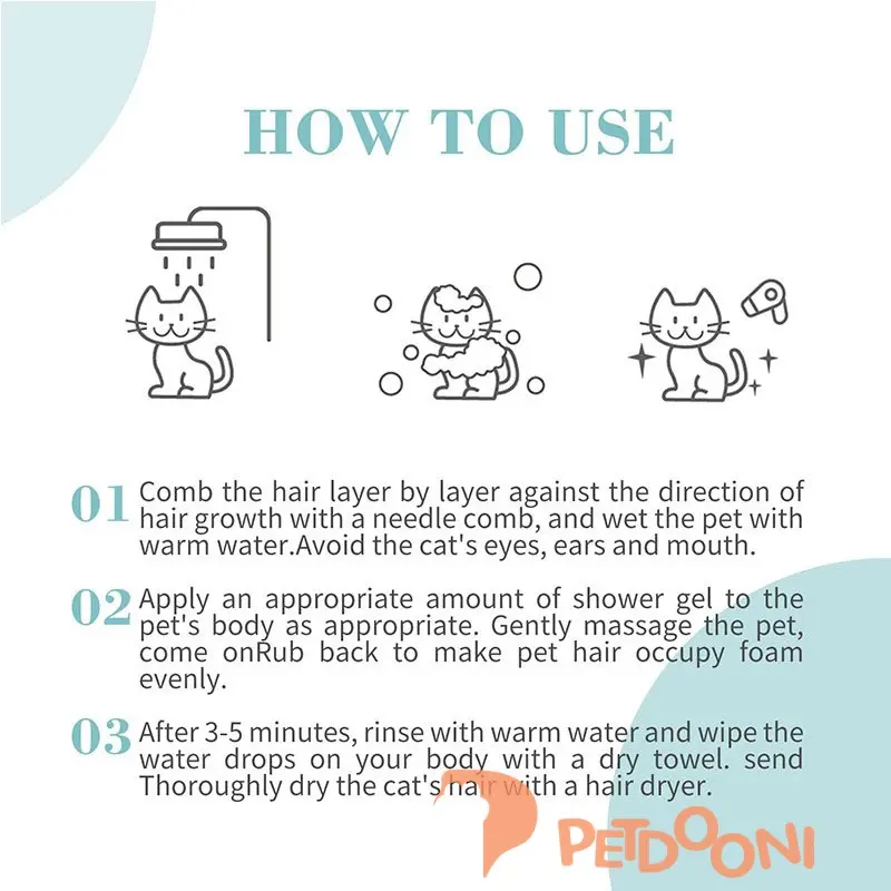 ابتدا موهای پت را به طور کامل با آب گرم خیس کنید. اگر ذرات گل و خاک به پوشش مویی گربه شما چسبیده است، آن را جدا کنید. سپس مقداری شامپو روی بدن پت ریخته و به آرامی ماساژ دهید. برای کمک به شست و شو، می توانید با استفاده از یک برس به آرامی ماساژ دهید. پس از اتمام این کار، با آب فراوان بشویید به طوری که شامپو کاملا از بدن پت پاک شود. سپس با استفاده از یک حوله مقداری از آب بدن گربه خود را بگیرید و پس از آن با استفاده از مسواک یا برس مخصوص، به طور مداوم موهای پت خود را برس کشیده و با باد ملایم سشوار کاملا خشک کنید.