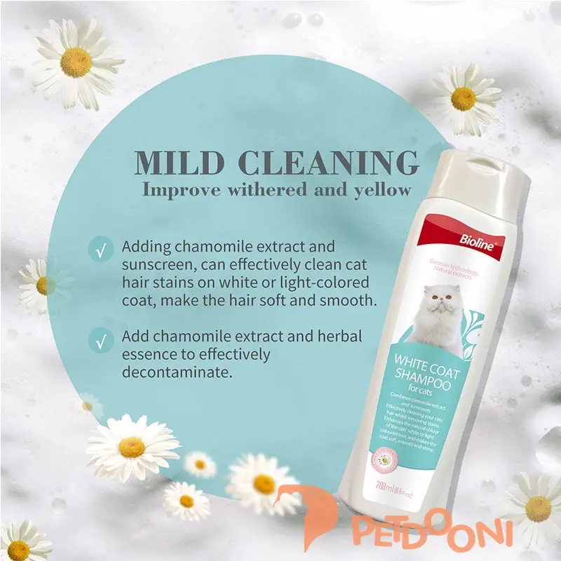 مناسب برای انواع نژاد گربه مناسب موهای روشن و سفید دارای خاصیت مراقبتی پوست و مو درخشان کننده پوست و مو باز کردن گره های مو مناسب برای پوست حساس از بین برنده کامل بوهای نامطبوع بدون ایجاد حساسیت حاوی عصاره بابونه حجم ۲۰۰ میلی لیتر
