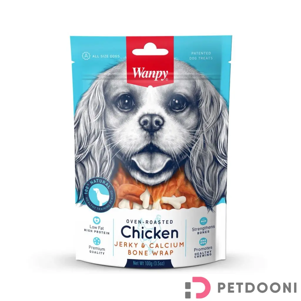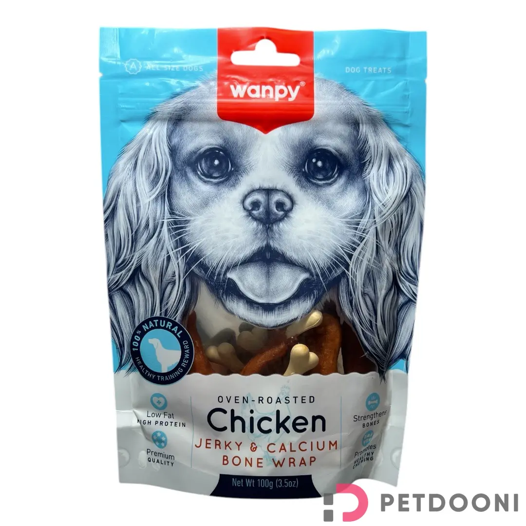 تشویقی سگ ونپی مدل استخوان با طعم مرغ حاوی کلسیم (Wanpy Jerky & Calcium Bone Wrap Dog Treat With Chicken Flavor)، مرغی که در این تشویقی به کار برده شده، در آون پخته شده تا خواص خود را به خوبی حفظ کند. طعم آن برای سگها بسیار ایده آل است و آنها را کاملاً به خود جذب می کند. کیفیت مواد اولیه به کار رفته در تولید آن بالاست و با استاندارهای همتراز با غذای انسانی تولید شده است.تکه های این تشویقی ترد هستند و به آسانی می توان آنها را به قسمتهای کوچکتر تقسیم کرد. پروتئین این محصول بالاست و چربی آن کاهش یافته، به همین دلیل به حفظ تناسب اندام سگها کمک می کند.تشویقی ونپی یک بافت نرم و ژلاتینی دارد و می توانید هم به عنوان میان وعده هم جایزه و تشویق برای کارکرد خوب سگتان از آن استفاده کنید.