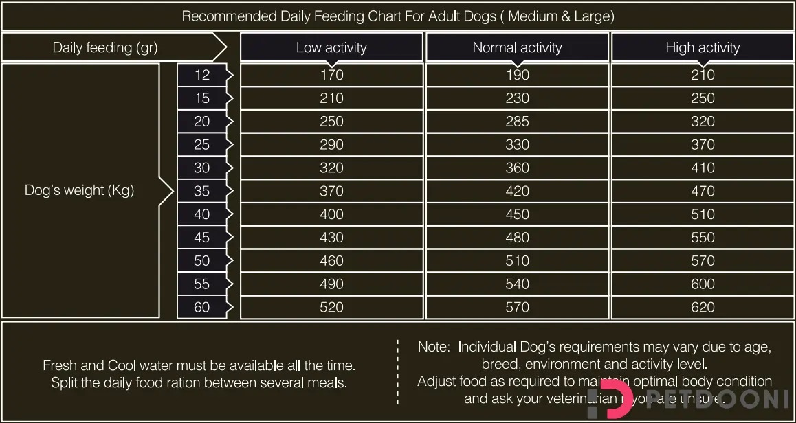 راهنمای مصرف پیشنهادی برای این محصول بهصورت دقیق روی بستهبندی درج شده است. توصیه میشود برای تنظیم دقیق برنامه غذایی سگ خود، حتماً از این جدول استفاده کنید.
