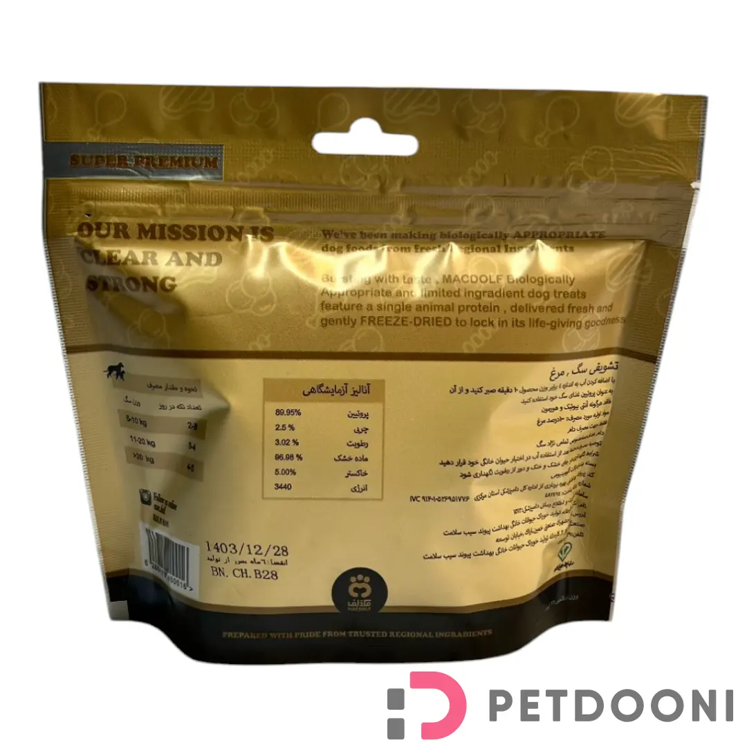 تشویقی فریز دراید سگ مک دولف یک میان وعده و پاداش لذیذ و خوشمزه برای دوست وفادارتان است. اگر از یک سگ نگهداری میکنید به احتمال زیاد اسم تشویقی به گوشتان خورده است. تشویقی به وعده کوچکی گفته میشود که به عنوان پاداش برای انجام یک رفتار مطلوب به سگ داده میشود. سگ ها عاشق تشویقی هستند و از خوردن آن لذت میبرند، دلایل بسیاری وجود دارد که صاحبان پت از تشویقی استفاده میکنند. خوردن تشویقی ها مقداری برای سگ ها زمان بر است و مواقعی که صاحب پت در منزل نیست میتوان با دادن تشویقی های جویدنی سگ را ساعت های طولانی سرگرم کرد. یکی از دلایل مهم دیگر که باعث استفاده از تشویقی میشود، از بین بردن جرم و پلای های دندان است، تشویقی های سخت و جویدنی جدا از اینکه باعث سرگرم شدن سگ میشود، جرم و پلاک های دندان را از بین میبرد و به سلامت دندان و لثه ها کمک میکند. تشویقی ها غریزه جویدنی سگ را تسکین میدهد، سگ ها به صورت غریزی عاشق جویدن هستند و دادن تشویقی های جویدنی باعث شاداب و خوشحالی سگ ها میشود. از این تشویقی فریز دراید سگ مک دولف میتوانید در کنار غذای خشک سرو کنید، یا برای آموزش و تشویقی استفاده کنید.ایجاد تنوع غذایی و دادن تشویقی های گوناگون به سگ ها باعث میشود، تا تمام نیاز های غذایی و تغذیه ای بدن کاملا تامین بشود و دیگر پت کمبود ویتامین و املاح معدنی نداشته باشد و به تقویت سلامت عمومی کمک شایانی میکند. وقتی که سگ پس از یادگیری یک آموزش تشویقی دریافت میکند، انگیزش برای یادگیری افزایش پیدا میکند. تشویقی های مکدولف به جدید ترین و مدرن ترین روش تولید شدند. محصولات فریزدراید بدلیل خشک شدن به روش انجمادی ارزش غذایی بسیار بالایی دارند، و عطر و طعمشون حفظ شده. حتما آب تازه و پاکیزه در اختیار سگ قرار دهید. تشویقی فریز دراید سگ مک دولف کاملا تازه و بدون مواد نگهدارنده است.