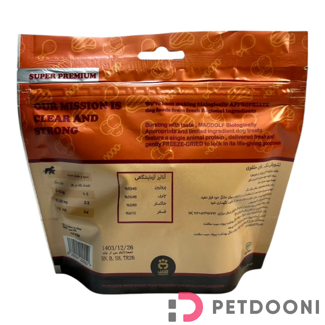 تشویقی فریز دراید سگ مک دولف یک میان وعده و پاداش لذیذ و خوشمزه برای دوست وفادارتان است. اگر از یک سگ نگهداری میکنید به احتمال زیاد اسم تشویقی به گوشتان خورده است. تشویقی به وعده کوچکی گفته میشود که به عنوان پاداش برای انجام یک رفتار مطلوب به سگ داده میشود. سگ ها عاشق تشویقی هستند و از خوردن آن لذت میبرند، دلایل بسیاری وجود دارد که صاحبان پت از تشویقی استفاده میکنند. خوردن تشویقی ها مقداری برای سگ ها زمان بر است و مواقعی که صاحب پت در منزل نیست میتوان با دادن تشویقی های جویدنی سگ را ساعت های طولانی سرگرم کرد. یکی از دلایل مهم دیگر که باعث استفاده از تشویقی میشود، از بین بردن جرم و پلای های دندان است، تشویقی های سخت و جویدنی جدا از اینکه باعث سرگرم شدن سگ میشود، جرم و پلاک های دندان را از بین میبرد و به سلامت دندان و لثه ها کمک میکند. تشویقی ها غریزه جویدنی سگ را تسکین میدهد، سگ ها به صورت غریزی عاشق جویدن هستند و دادن تشویقی های جویدنی باعث شاداب و خوشحالی سگ ها میشود. از این تشویقی فریز دراید سگ مک دولف میتوانید در کنار غذای خشک سرو کنید، یا برای آموزش و تشویقی استفاده کنید.ایجاد تنوع غذایی و دادن تشویقی های گوناگون به سگ ها باعث میشود، تا تمام نیاز های غذایی و تغذیه ای بدن کاملا تامین بشود و دیگر پت کمبود ویتامین و املاح معدنی نداشته باشد و به تقویت سلامت عمومی کمک شایانی میکند. وقتی که سگ پس از یادگیری یک آموزش تشویقی دریافت میکند، انگیزش برای یادگیری افزایش پیدا میکند. تشویقی های مکدولف به جدید ترین و مدرن ترین روش تولید شدند. محصولات فریزدراید بدلیل خشک شدن به روش انجمادی ارزش غذایی بسیار بالایی دارند، و عطر و طعمشون حفظ شده. حتما آب تازه و پاکیزه در اختیار سگ قرار دهید. تشویقی فریز دراید سگ مک دولف کاملا تازه و بدون مواد نگهدارنده است.