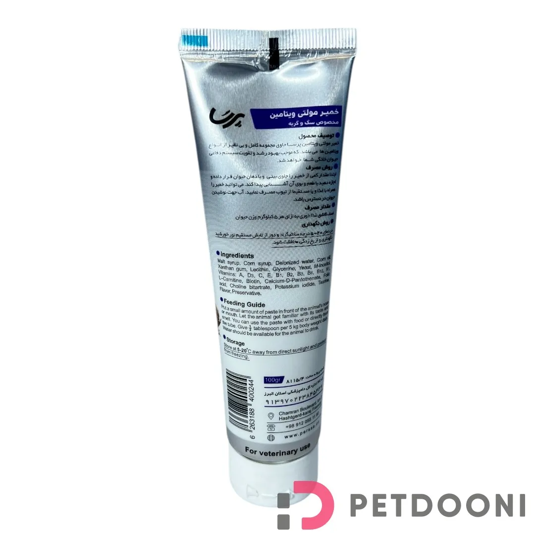 خمیر مولتی ویتامین پرسا حاوی مجموعه کاملی از ویتامین های مورد نیاز سگ شما می باشد. وجود ویتامین E و C در این محصول موجب محافظت از سلول ها در مقابل عوامل آسیب رسان شده و سیستم دفاعی بدن را تقویت می کند. ال-کارنیتین موجود در این مکمل موجب تقویت عضلات شده، همچنین به چربی سوزی بهتر کمک می کند. اضافه نمودن بیوتین به این مجموعه موجب حمایت از عملکرد سیستم عصبی شده، همچنین در بهبود سلامت پوست و پوشش مویی موثر است. مصرف این مکمل خوشمزه و مغذی در عین حال که به حفظ سلامت حیوان کمک می نماید، مجموعه کاملی از مواد مغذی و انرژی زا را فراهم نموده، که به سادگی جذب بدن می شود. باید دانست در شرایطی مانند بیماری، دوران نقاهت، پس از عمل جراحی و … که سگ شما غذای کافی نمی خورد، این محصول به تحریک اشتهای حیوان کمک نموده و در عین حال در بهبود وزن گیری موثر است. مواد تشکیل دهنده عالی، فرمول خاص و آماده سازی دقیق، خمیر مولتی ویتامین پرسا را به یک ترکیب منحصر به فرد تبدیل نموده است.