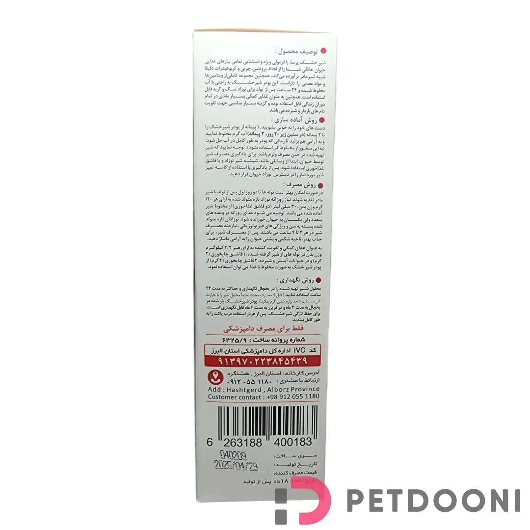 • حاوی ویتامین و مواد ضروری جهت رفع نیازهای غذایی سگ و گربه • دارای پروتئین، چربی و کربوهیدرات • جایگزینی مناسب برای شیرمادر • فرمولی ویژه شبیه شیر مادر • هضم آسان • سهولت حل شدن در آب، داشتن بو و طعم عالی
