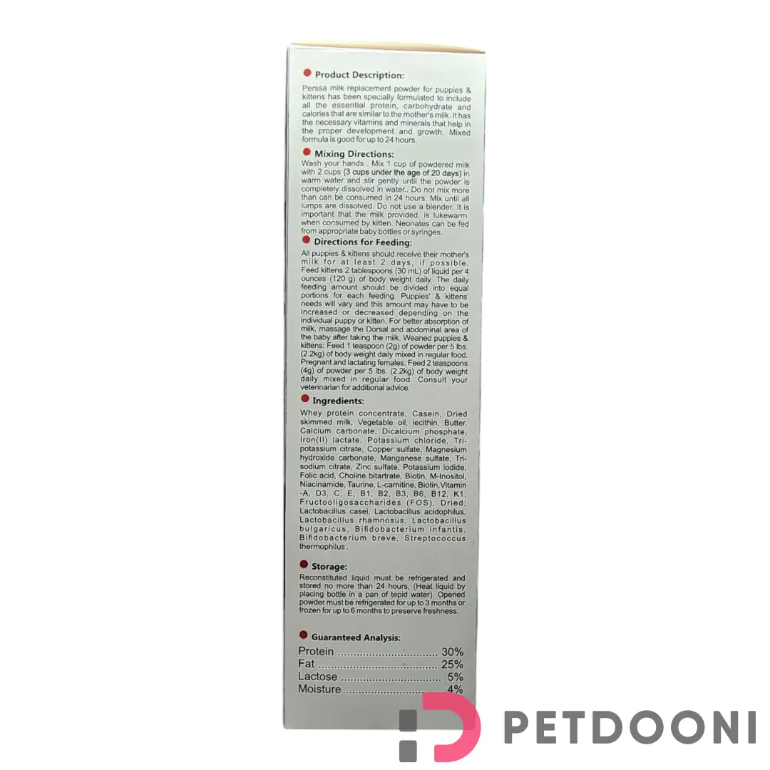 این محصول با فرمولی ویژه و استثنایی تمامی نیازهای غذایی حیوان خانگی شما را از لحاظ پروتئین، چربی و کربوهیدرات دقیقا شبیه شیر مادر برآورده می کند، همچنین مجموعه کاملی از ویتامین ها و مواد معدنی را داراست. برای ساخت این شیرخشک از شیر بسیار با کیفیت استفاده شده، که درصد فیبر آن نیز صفر می باشد. همچنین این محصول سطح لاکتوز بسیار پایینی دارد، بنابراین در نژادهایی از گربه هم که به لاکتوز حساسند مشکلی ایجاد نمی کند. مصرف شیرخشک پرسا موجب می شود که نوزاد وزن گیری مطلوبی داشته و به سطح مناسبی از رشد برسد. این پودر شیرخشک به راحتی با آب مخلوط شده و 24 ساعت پس از تولد برای نوزاد سگ و گربه قابل استفاده است. ترکیبات لبنی موجود در شیرخشک پرسا سرشار از اسیدهای آمینه، ویتامین¬ها و مواد معدنی مورد نیاز رشد می باشد. همچنین پروتئین موجود در پودر پنیر فرموله شده، حاوی اسیدهای آمینه ای است که در توسعه و رشد عضلات، پوست و سایر قسمت های بدن موثر است. شیرخشک پرسا با سلول های مخمر و پروبیوتیک غنی شده، که هر دوی این اجزا موجب کنترل باکتری های بیماری زای دستگاه گوارش شده و از طرفی مجموعه باکتری های مفید را حمایت می کنند.