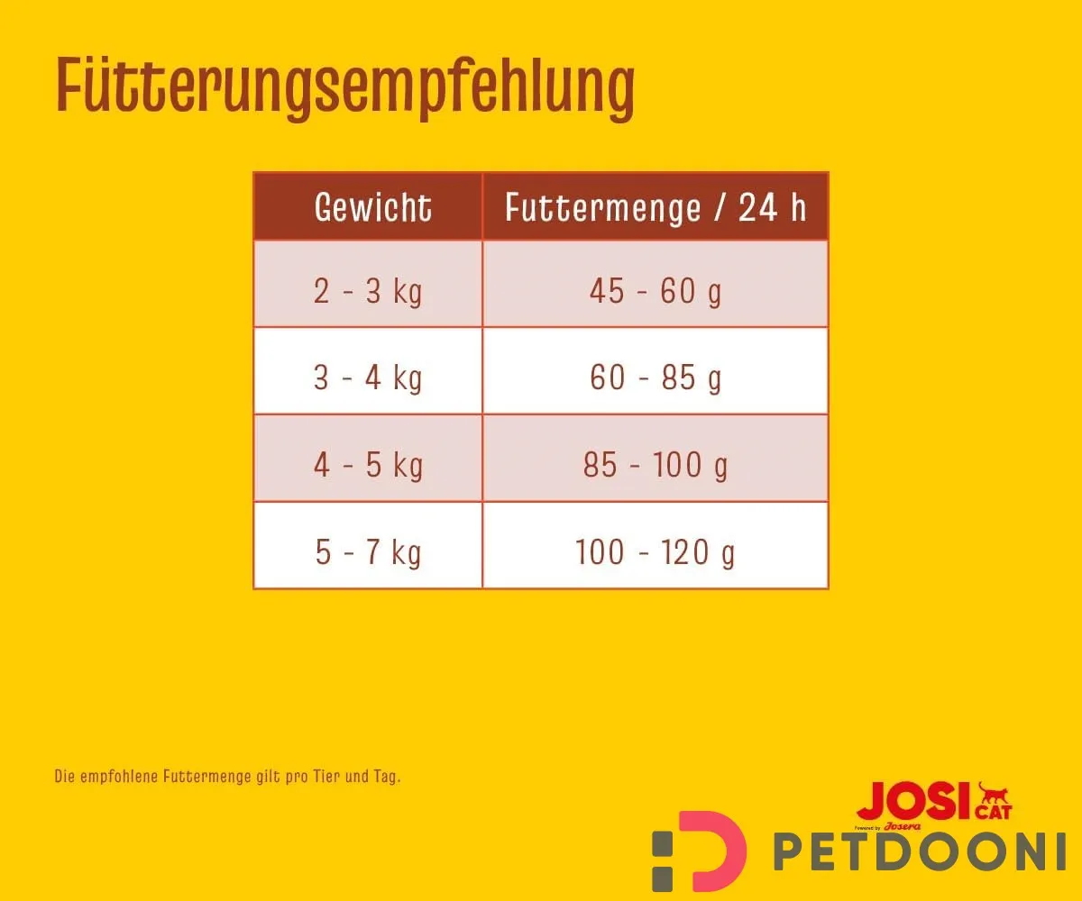 برای کسب بهترین نتیجه از مصرف غذای خشک گربه جوسرا جوسی کت با طعم گوشت، رعایت مقدار مناسب و روش صحیح تغذیه بسیار مهم است. میزان مصرف این غذا بسته به وزن، سن، سطح فعالیت و وضعیت بدنی گربه شما متفاوت خواهد بود.