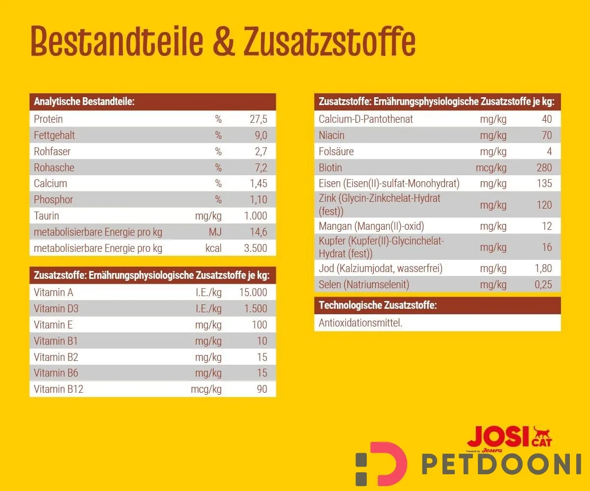 غذای خشک گربه جوسرا جوسی کت با طعم گوشت با فرمولی متعادل و علمی تهیه شده که تمامی نیازهای تغذیهای گربههای بالغ را پوشش میدهد. ترکیبات این محصول نشاندهنده کیفیت بالا و دقت در انتخاب مواد اولیه هستند: