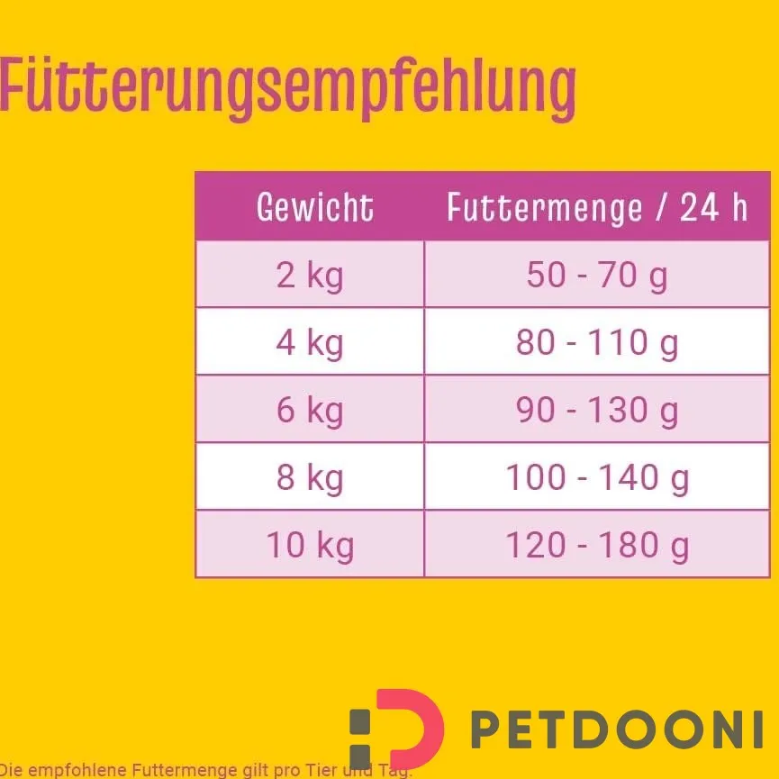 وزن سگ میزان غذا 2 کیلوگرم 50-70 گرم 4 کیلوگرم 80- 110 گرم 6 کیلوگرم 90-130 گرم 8 کیلوگرم 100-140 گرم 10 کیلوگرم 120-180 گرم