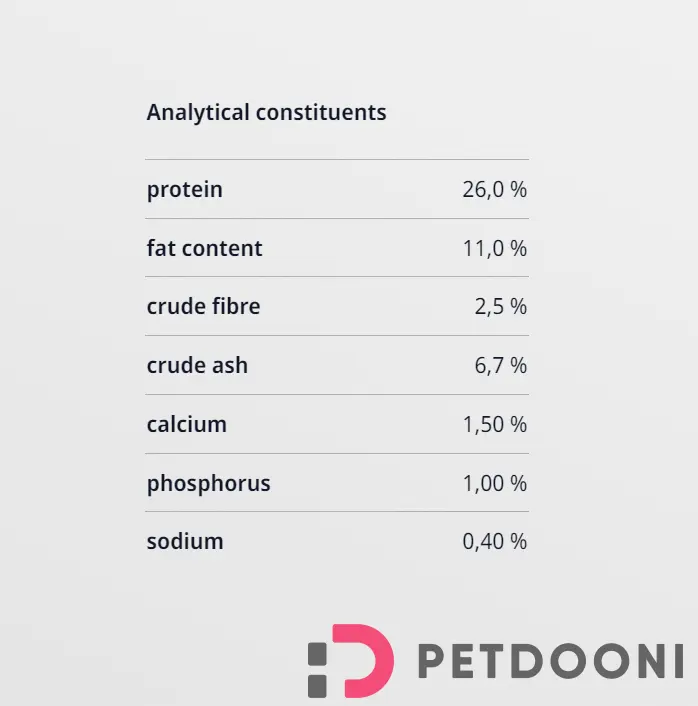 این غذا حاوی ۲۶٪ پروتئین و ۱۱٪ چربی است که انرژی مورد نیاز روزانه سگهای فعال را تأمین میکند. بیش از ۷۸٪ پروتئین این محصول از منابع حیوانی باکیفیت (مانند گوشت پرندگان) استخراج شده که نقش مهمی در تقویت عضلات و سلامت عمومی بدن سگ ایفا میکند.