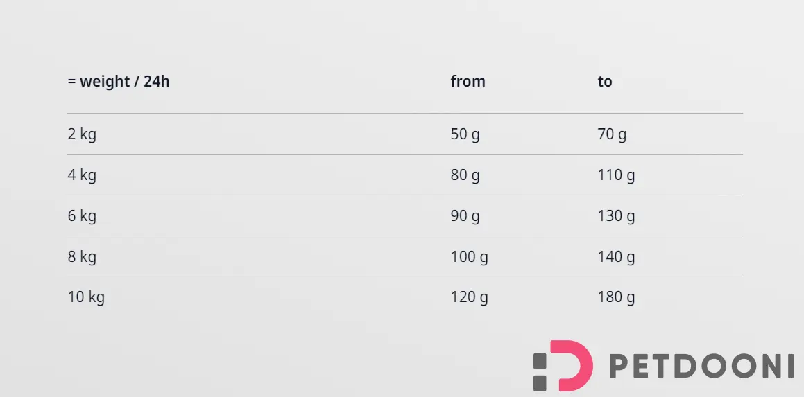 وزن سگ میزان غذا 2 کیلوگرم 50-70 گرم 4 کیلوگرم 80- 110 گرم 6 کیلوگرم 90-130 گرم 8 کیلوگرم 100-140 گرم 10 کیلوگرم 120-180 گرم