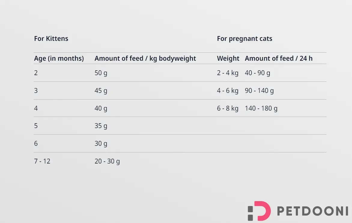 "مقدار مصرف روزانه" بچه گربه 2 ماهه: به ازای هر کیلوگرم وزن بدن 55 گرم بچه گربه 3 ماهه: به ازای هر کیلوگرم وزن بدن 50 گرم بچه گربه 4 ماهه: به ازای هر کیلوگرم وزن بدن 45 گرم بچه گربه 5 ماهه: به ازای هر کیلوگرم وزن بدن 40 گرم بچه گربه 6 ماهه: به ازای هر کیلوگرم وزن بدن 35 گرم بچه گربه 12-7 ماهه: به ازای هر کیلوگرم وزن بدن 25 تا 30 گرم گربه باردار با وزن 2-4 کیلوگرم 50 تا 100 گرم گربه باردار با وزن 4-6 کیلوگرم 100 تا 150 گرم گربه باردار با وزن 6-8 کیلوگرم 150 تا 190 گرم