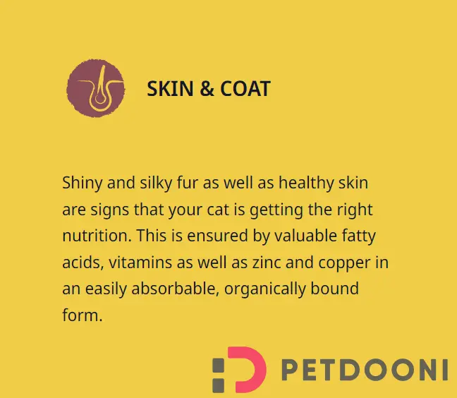 وجود اسیدهای چرب ضروری مانند امگا ۳ و امگا ۶ به حفظ پوست لطیف و سالم و همچنین درخشش و نرمی موی گربه کمک میکند چیزی که بهوضوح در ظاهر کیتن شما قابل مشاهده خواهد بود.