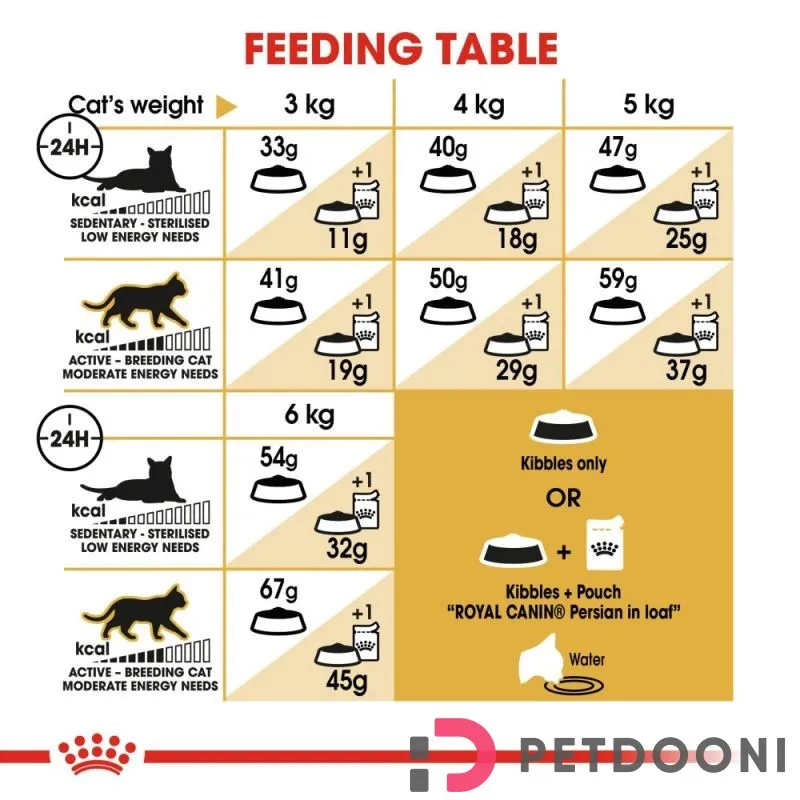 میزان مصرف روزانه غذای خشک گربه بالغ به عواملی مانند وزن، میزان فعالیت، شرایط سلامتی و وضعیت جسمی گربه بستگی دارد. جدول زیر مقدار تقریبی توصیهشده برای تغذیه گربههای بالغ نژاد پرشین را نشان میدهد: