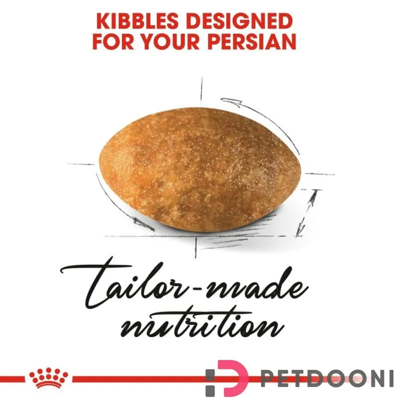 دانههای این غذا بهشکل بادامی و مسطح طراحی شدهاند تا با ساختار فک خاص گربههای پرشین (که صورت تخت و فک کوتاه دارند) سازگار باشند. این شکل خاص باعث میشود غذا راحتتر برداشته و جویده شود، و همچنین در حفظ بهداشت دهان و دندان مؤثر است.