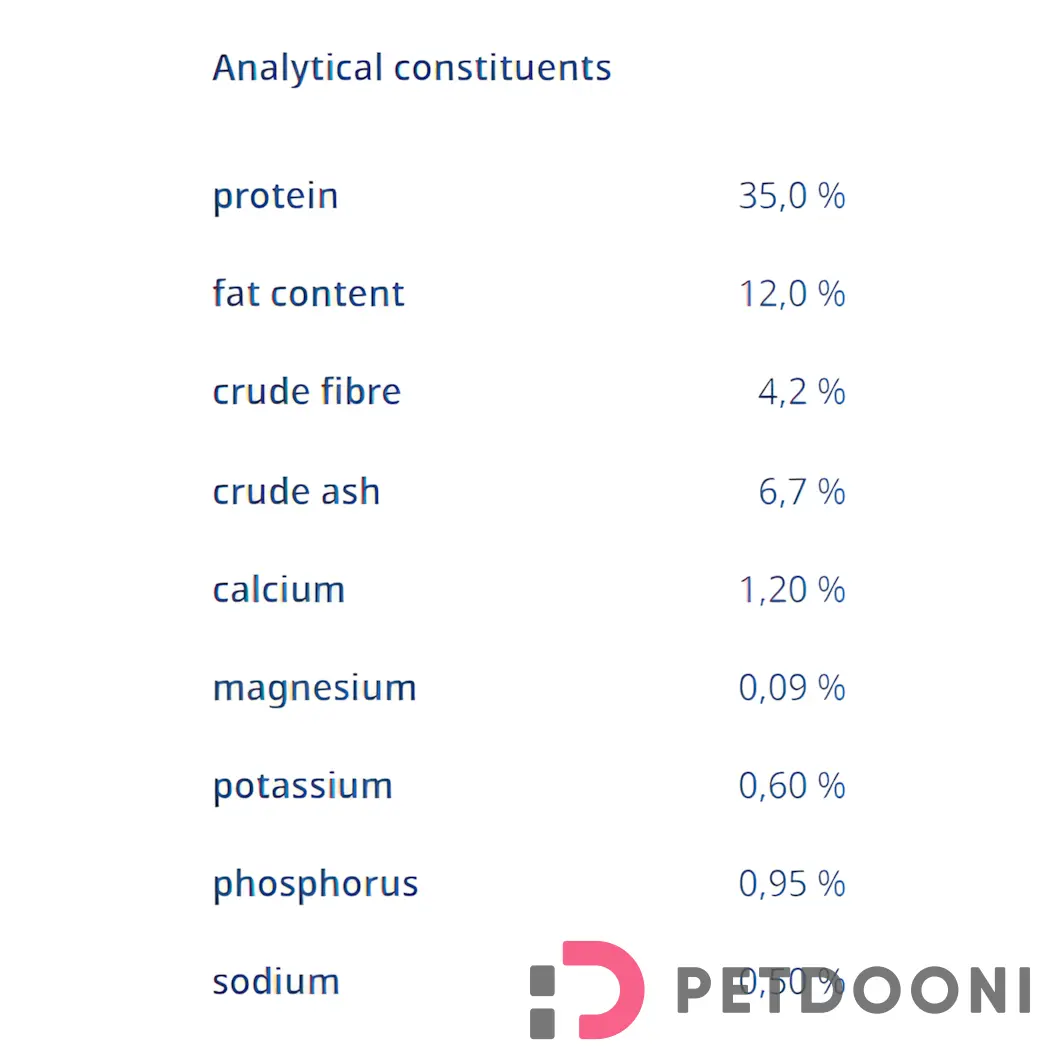در تولید این غذا از پروتئینهای باکیفیت حیوانی، ویتامینها و مواد معدنی ضروری استفاده شده است. ترکیبات این محصول فاقد غلات (Grain-Free) است و برای گربههایی با سیستم گوارشی حساس بسیار مناسب است.