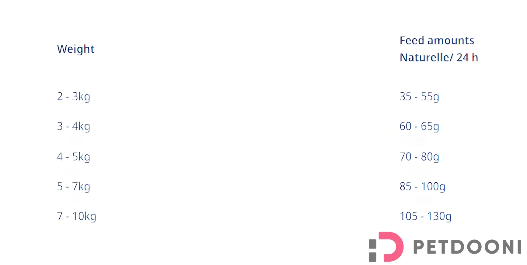 "مقدار مصرف روزانه بر اساس وزن گربه" 2-3 کیلوگرم : 45-30 گرم 3-4 کیلوگرم : 60-45 گرم 4-5 کیلوگرم : 75-60 گرم 5-7 کیلوگرم : 110-75 گرم 7-10 کیلوگرم: 140-110 گرم