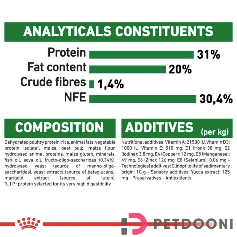 با ترکیب غنی از اسیدهای چرب امگا ۳ و ۶، کلسیم و فسفر، غذای خشک رویال کنین به درخشش مو، سلامت پوست و تقویت استخوانها و دندانها کمک شایانی میکند.