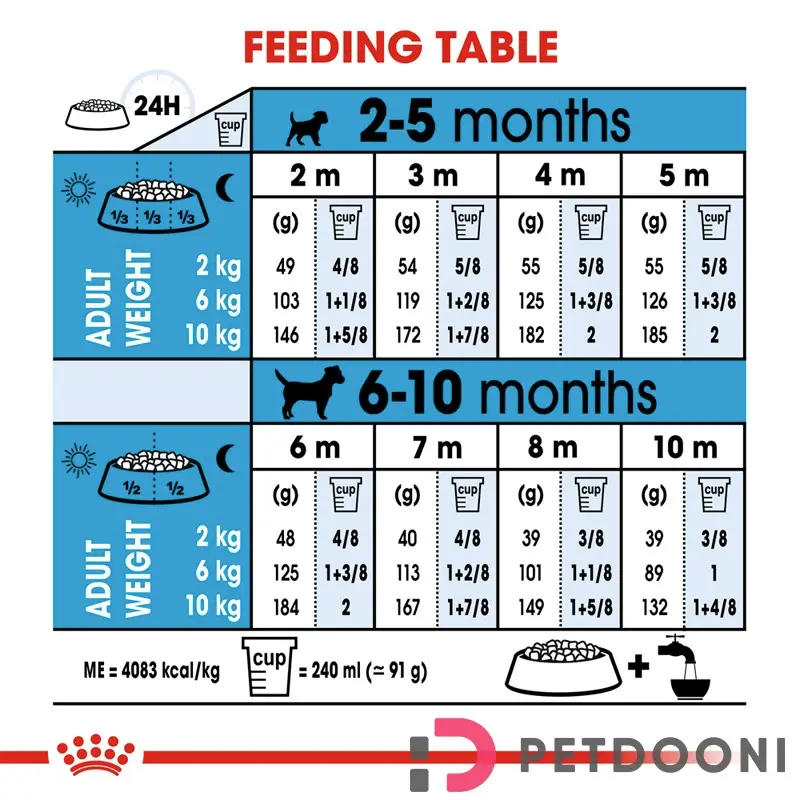 مقدار مصرف روزانه غذای خشک توله سگ رویال کنین به عوامل مختلفی از جمله سن، وزن فعلی توله، سطح فعالیت بدنی و نژاد سگ بستگی دارد. برای رسیدن به نتایج مطلوب و پیشگیری از چاقی یا سوءتغذیه، توصیه میشود دقیقاً مطابق با جدول راهنمای تغذیه درجشده روی بستهبندی عمل کنید.