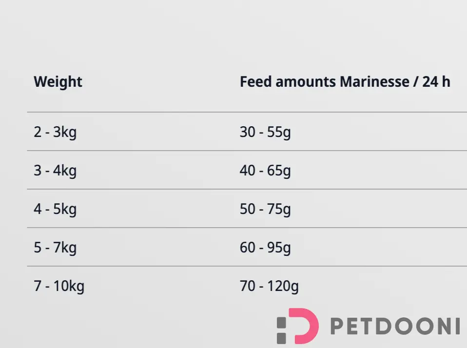 "مقدار مصرف روزانه بر اساس وزن گربه" 2-3 کیلوگرم : 55-30 گرم 3-4 کیلوگرم : 65-40 گرم 4-5 کیلوگرم : 75-50 گرم 5-7 کیلوگرم : 95-60 گرم 7-10 کیلوگرم: 120-70 گرم