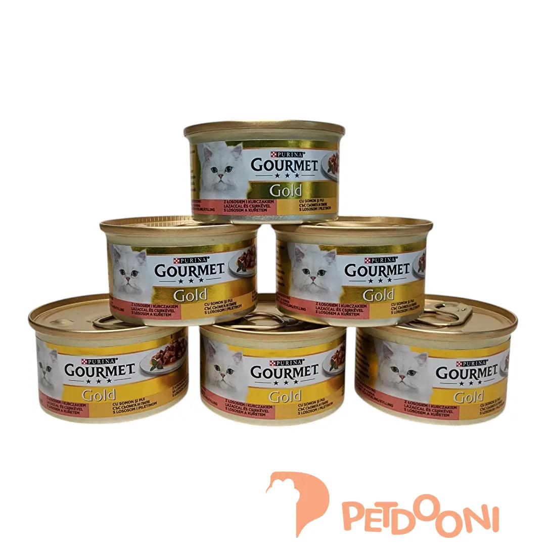 کنسرو گربه گورمه گلد با طعم مرغ و ماهی سالمون درسس (Gourmet Gold With Chicken & Salmon In Gravy)، غذایی دلچسب و تازه برای گربه های سخت پسند می باشد. تکه های تازه گوشت مرغ و ماهی سالمون به آرامی کامل پخته شده و در نهایت در عصاره گوشت اشتهاآور غوطه ور می شوند تا لذت یک عطر و طعم خاص را به گربه شما بدهند. در طبخ این غذا هیچگونه مواد معطر یا غیر طبیعی استفاده نشده است و به همین دلیل این کنسرو غذایی کامل، متعادل و سالم برای گربه شما می باشد.اگر گربه شما بدغذاست، این کنسروهای بسیار خوشمزه برای تحریک اشتهای هر گربه ای کافیست.این کنسروها هم به عنوان غذای اصلی هم به عنوان مکمل غذای خشک بصورت مخلوط کردن با غذای خشک استفاده میشود.