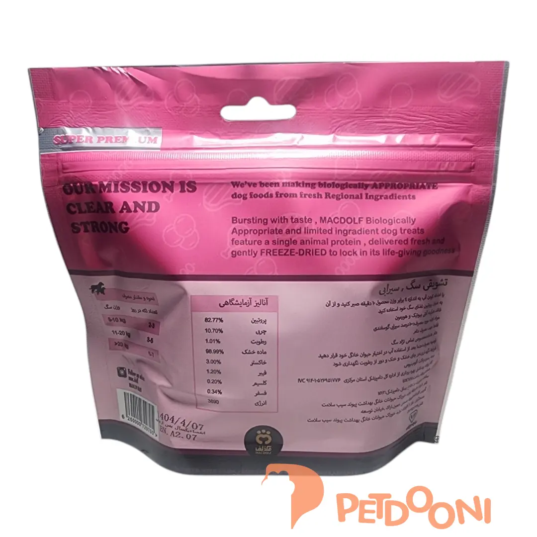 تشویقی فریز دراید سگ مک دولف طعم سیرابی یک میان وعده و پاداش لذیذ و خوشمزه برای دوست وفادارتان است. تشویقی های مکدولف به جدید ترین و مدرن ترین روش تولید شدند. محصولات فریزدراید بدلیل خشک شدن به روش انجمادی ارزش غذایی بسیار بالایی دارند، و عطر و طعمشون حفظ شده. از این تشویقی ها میتوانید در کنار غذای خشک سرو کنید، یا برای آموزش و تشویقی استفاده کنید. اگر از یک سگ نگهداری میکنید به احتمال زیاد اسم تشویقی به گوشتان خورده است. تشویقی به وعده کوچکی گفته میشود که به عنوان پاداش برای انجام یک رفتار مطلوب به سگ داده میشود. سگ ها عاشق تشویقی هستند و از خوردن آن لذت میبرند، دلایل بسیاری وجود دارد که صاحبان پت از تشویقی استفاده میکنند. خوردن تشویقی ها مقداری برای سگ ها زمان بر است و مواقعی که صاحب پت در منزل نیست میتوان با دادن تشویقی های جویدنی سگ را ساعت های طولانی سرگرم کرد. یکی از دلایل مهم دیگر که باعث استفاده از تشویقی میشود، از بین بردن جرم و پلای های دندان است، تشویقی های سخت و جویدنی جدا از اینکه باعث سرگرم شدن سگ میشود، جرم و پلاک های دندان را از بین میبرد و به سلامت دندان و لثه ها کمک میکند. تشویقی ها غریزه جویدنی سگ را تسکین میدهد، سگ ها به صورت غریزی عاشق جویدن هستند و دادن تشویقی های جویدنی باعث شاداب و خوشحالی سگ ها میشود. تشویقی ها طعم و مزه لذیذی دارند و با دادن تشویقی باعث مشود رابطه عاطفی عمیقی بین صاحب پت و پت برقرار میکند. ایجاد تنوع غذایی و دادن تشویقی های گوناگون به سگ ها باعث میشود، تا تمام نیاز های غذایی و تغذیه ای بدن کاملا تامین بشود و دیگر پت کمبود ویتامین و املاح معدنی نداشته باشد و به تقویت سلامت عمومی کمک شایانی میکند. وقتی که سگ پس از یادگیری یک آموزش تشویقی دریافت میکند، انگیزش برای یادگیری افزایش پیدا میکند. در کنار تشویقی فریز دراید سگ مک دولف طعم سیرابی حتما آب تازه و پاکیزه در اختیار سگ قرار دهید.