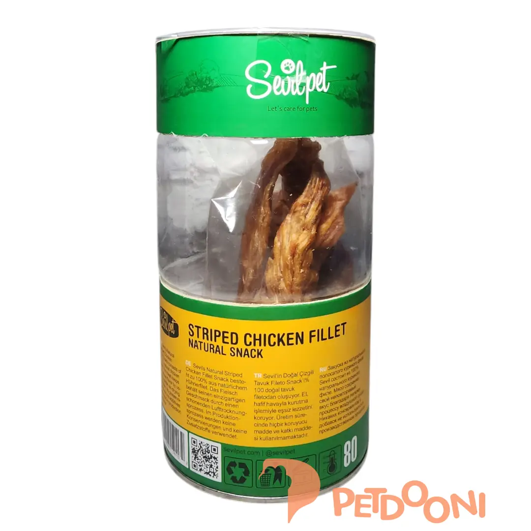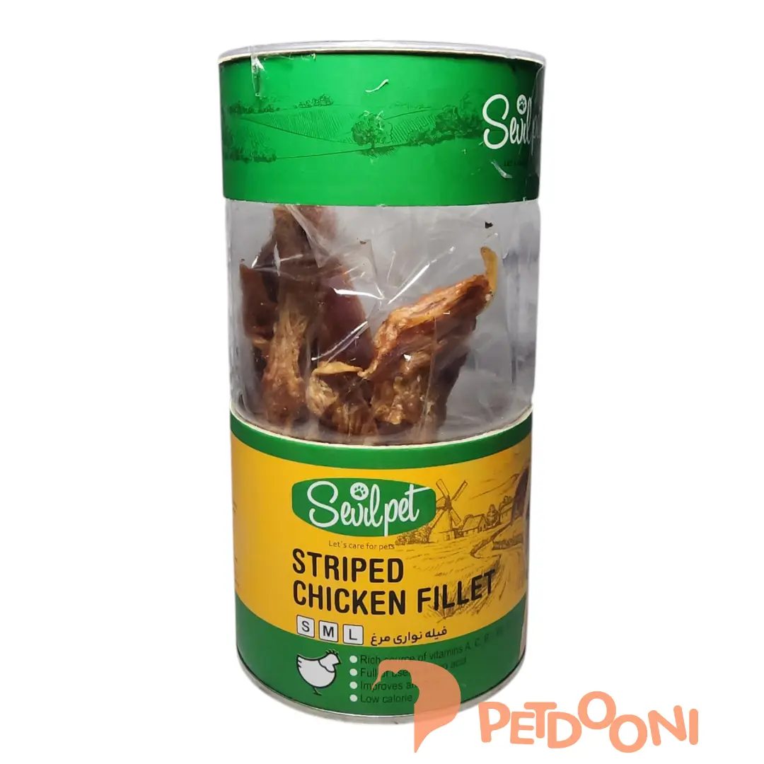 تشویقی فیله مرغ نواری سویل پت تهیه شده از مرغ تازه می باشد که به صورت خشک شده در بسته بندی های ۸۰ گرمی تهیه شده است. این محصول دارای پروتیین مرغ است که یک پروتیین لازم برای بدن سگ ها می باشد. گروه ویتامین های B در این محصول به وفور رویت می شودن که این مورد یکی از ویژگی های برجسته تشویقی فیله مرغ نواری سویل پت به شمار می آید این محصول دارای بو و طعمی لذیذ برای حیوانات است و حتی حیوانات بد غذا را به وجد می آورد. تشویقی فیله مرغ نواری سویل پت دارای پروتیین بالا و چربی کم است و کالری آن به شکلی تنظیم شده است که باعث چاقی حیوانات خانگی نشود. تشویقی فیله مرغ نواری سویل پت فرآوری و خشک کردن محصول به صورت آرام و طبیعی صورت گرفته که این موضوع باعث شده است خواص و ویژگی های مرغ حفظ شود. از دیگر ویژگی های این محصول می توان به هضم آسان اشاره کرد. در تشویقی فیله مرغ نواری سویل پت از هیچ گونه مواد طعم دهتده و نگهدارنده استفاده نشده است که این موضوع باعث می شود محصول را با آرامش خاطر در اختیار حیوان قرار داد.