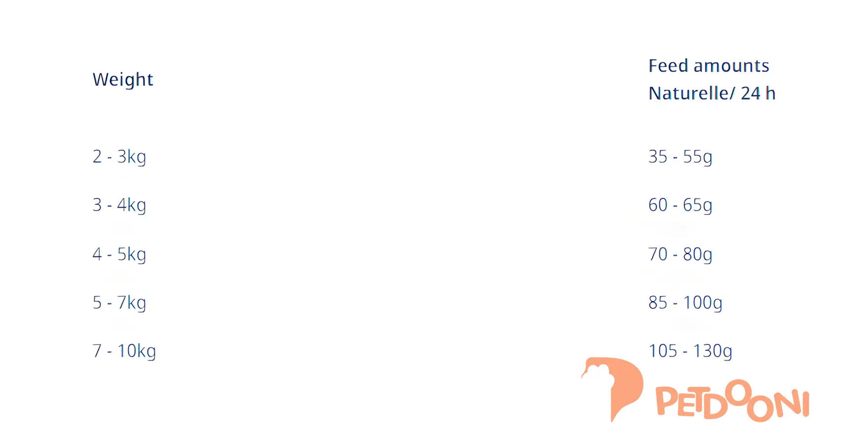 "مقدار مصرف روزانه بر اساس وزن گربه" 2-3 کیلوگرم : 45-30 گرم 3-4 کیلوگرم : 60-45 گرم 4-5 کیلوگرم : 75-60 گرم 5-7 کیلوگرم : 110-75 گرم 7-10 کیلوگرم: 140-110 گرم