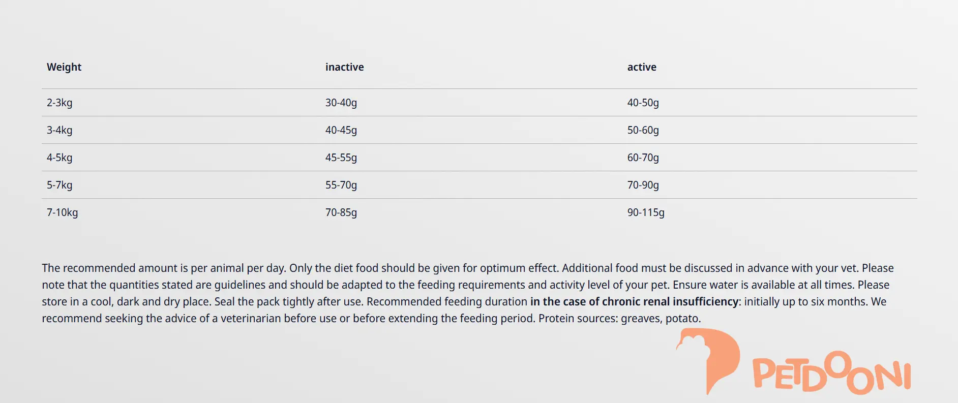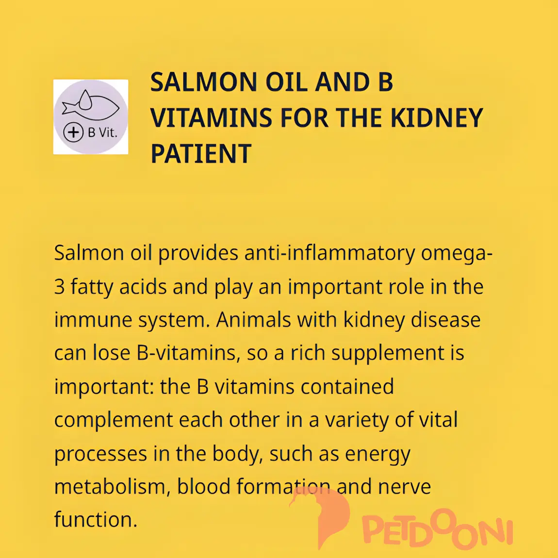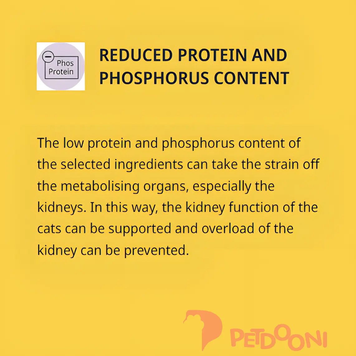این غذا مخصوص گربههایی است که مشکلات کلیوی دارند و با تامین تمام ویتامینهای مهم، مواد معدنی و عناصر کمیاب موردنیاز، انرژی موردنیاز گربه را فراهم میکند. مقادیر کم پروتئین و فسفر از بروز درد کلیهها جلوگیری کرده و محتوای بالای ویتامین B کمبود این ماده مغذی مهم در انواع فرآیندهای حیاتی بدن، مانند متابولیسم انرژی، خونسازی و عملکرد اعصاب را جبران میکند.