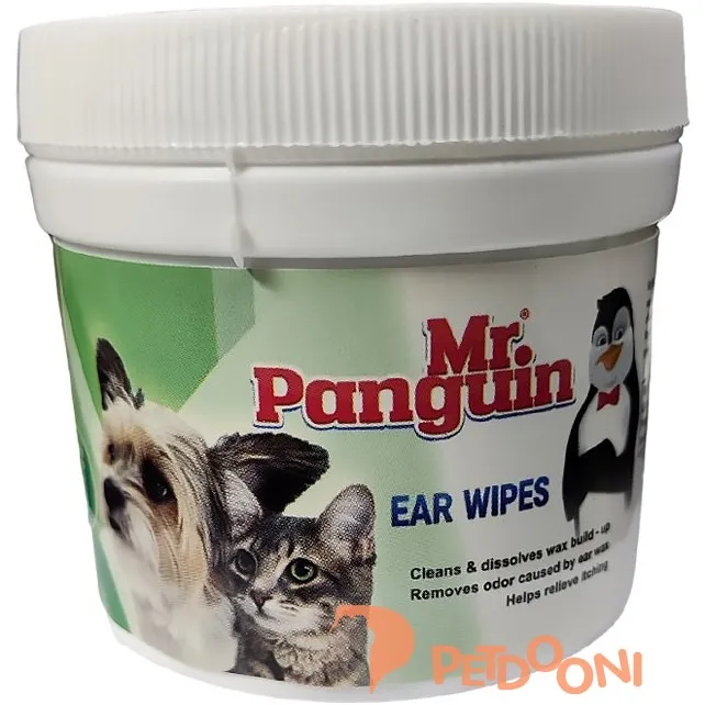 نظافت گوش سگ و گربه ها امری بسیار مهم است که در سلامتی آن ها نقش مهمی دارد. اگر ترشحات گوش سگ و گربه به موقع و به طور منظم تمیز نشوند می توانند باعث عفونت و مشکلات جدی برای سلامتی آن ها شوند. یکی از راه های تشخیص عفونت گوش بو کردن آن است. اگر سگ یا گربه شما دچار عفونت گوش شده باشد بوی بدی از آن استشمام می شود که در این مورد بهتر است به دامپزشک مراجعه نمایید. دستمال مرطوب حیوانات خانگی مستر پنگوئن مدل ear wipe وزن 70 گرم یک تمیز کننده عالی برای گوش سگ و گربه و سایر حیوانات خانگی است. استفاده از این محصول بسیار آسان است و به راحتی گوش را از آلودگی، کثیفی و چربی پاک می کند و هیچگونه حساسیتی برای حیوان خانگی ایجاد نمی کند.