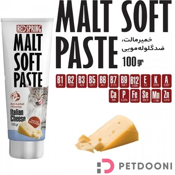 • عصاره مالت و خمیر مولتیویتامین غنی شده مخصوص گربه • مناسب برای گربههای تمامی نژادها • تهیه شده از طعم دهنده طبیعی پنیر ایتالیایی بدون افزودنی • ضد گلوله مویی به دلیل وجود سلولز در مالت • حاوی ویتامین های K، E، A و مواد معدنی مورد نیاز بدن • دارای ویتامین های گروه B • تقویت کننده سیستم گوارش و روده • دارای کلسیم مناسب برای حفظ سلامت استخوانها • بسیار لذیذ و خوشطعم