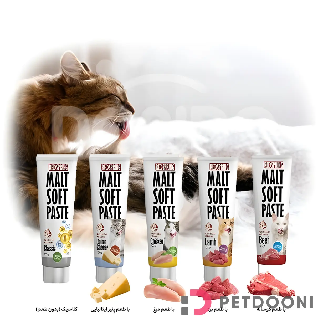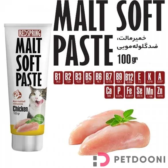 • عصاره مالت و خمیر مولتیویتامین غنی شده مخصوص گربه • ضد گلوله مویی به دلیل وجود سلولز در مالت • تقویت کننده سیستم گوارش و روده • دارای کلسیم مناسب برای حفظ سلامت استخوانها • حاوی ویتامین های K، E، A و مواد معدنی مورد نیاز بدن • حاوی طعم دهنده طبیعی مرغ بدون افزودنی • دارای ویتامین های گروه B
