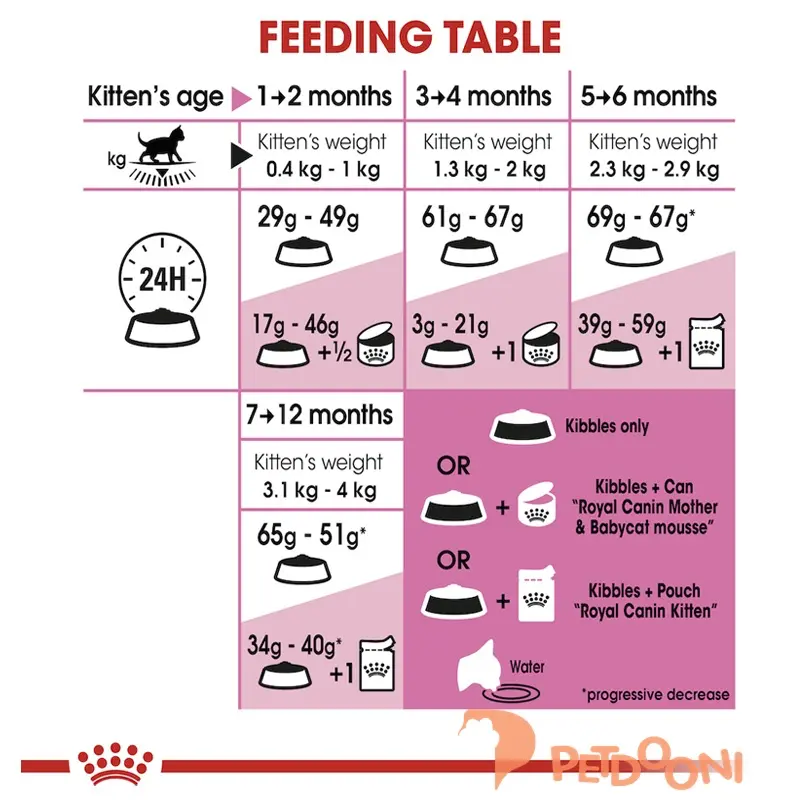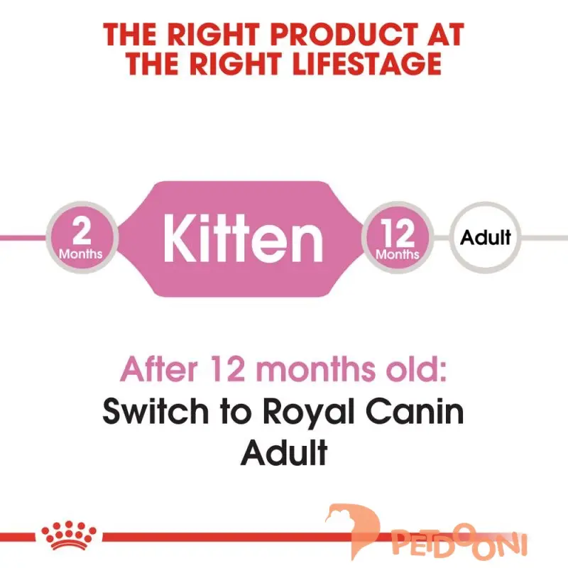 غذای خشک بچه گربه رویال کنین مدل Kitten تا ۱۲ ماهگی، به رشد سالم و رشد طبیعی مغز و بینایی کمک می کند، با پروتئینهای بسیار قابل هضم از حدود 4 ماهگی رشد بچه گربه ی شما کند می شود، اما سطح فعالیتش مثل همیشه بالاست! در این مدت، بچه گربه شما به تغذیه مناسب مانند غذای خشک بچه گربه رویال کنین مدل Kitten نیاز دارد تا به رشد سالم استخوان ها، عضلات، اندام ها، سیستم ایمنی و سیستم عصبی کمک کند. این غذا به طور ویژه برای رفع نیازهای تغذیه ای بچه گربه ها در "مرحله تثبیت" که بین ماه های 4 تا 12 زندگی اتفاق می افتد، ساخته شده است. این غذا حاوی سطوح مناسبی از پروتئین، مواد معدنی و ویتامین ها است که همگی برای رفع نیازهای انرژی بچه گربه شما و حمایت از رشد استخوان و ماهیچه سالم طراحی شده اند. دانه ی آن حاوی مواد مغذی مانند ویتامین C و E است که به بچه گربه شما کمک می کند تا سیستم ایمنی بدن خود را بهینه کند. اسیدهای چرب امگا 3 از رشد طبیعی مغز حمایت می کنند و بینایی سالم را تقویت می کنند. ترکیبی از پری بیوتیک های مفید (MOS) و پروتئین های بسیار قابل هضم کمک به تعادل فلور روده می کند. دانه غذای خشک بچه گربه رویال کنین به طور ویژه برای فک های کوچک بچه گربه ها ساخته شده است. همچنین هنگام جویدن گربه شما یک اثر مسواک زدن مکانیکی را ارائه می دهد که می تواند از بهداشت مطلوب دندان در بچه گربه ها پشتیبانی کند.